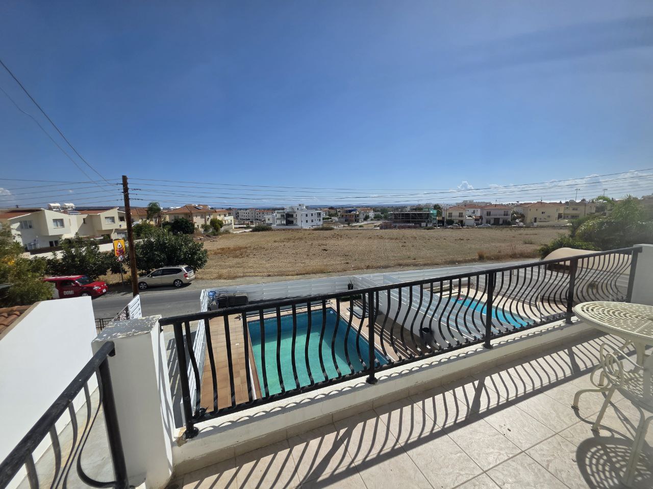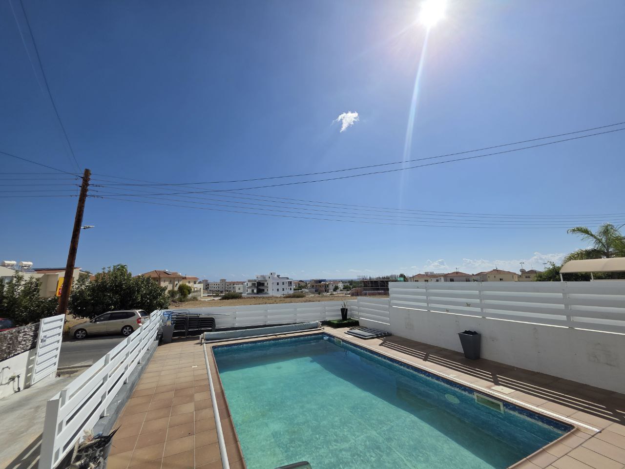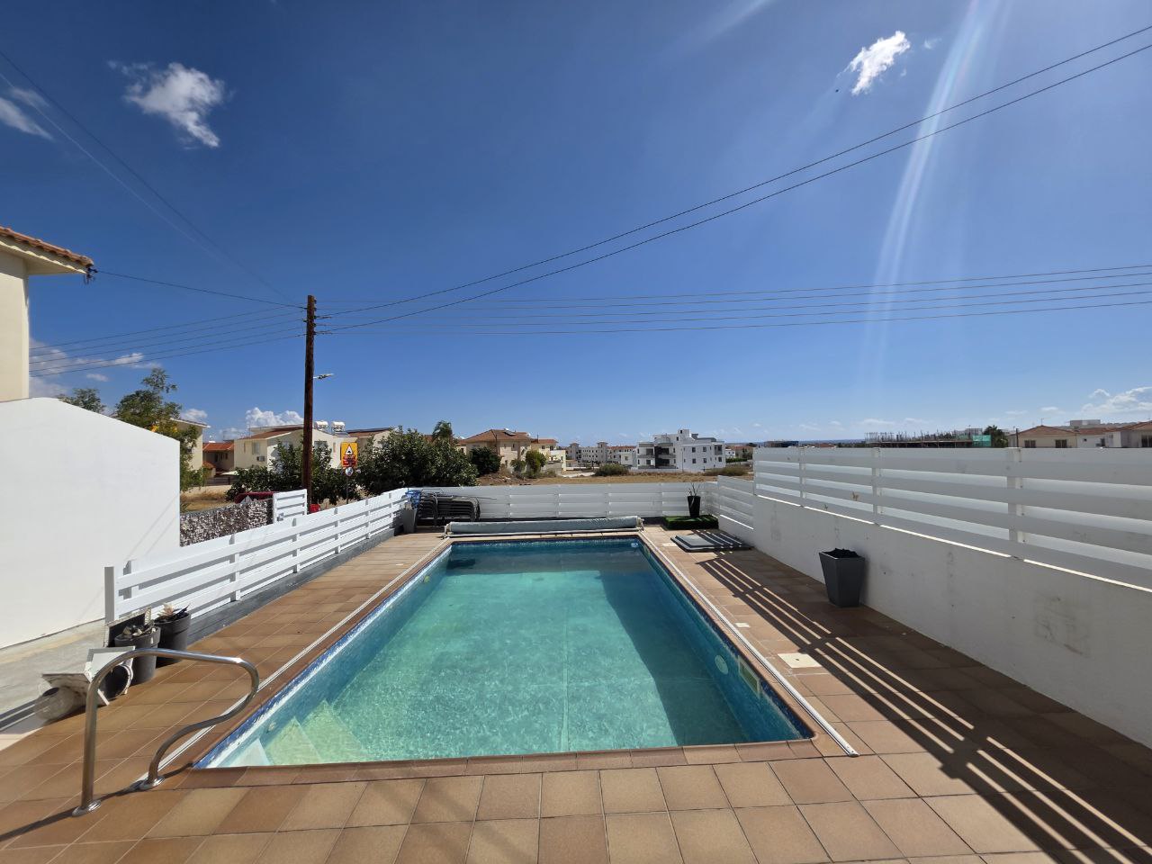 For sale a cozy three-bedroom house with a swimming pool and sea views, located on the hills in the area of Oroklini, Larnaca. On the ground floor there is a spacious living room, a separate kitchen and a guest bathroom. From the living room there is access to an outdoor terrace with a swimming pool, and from the kitchen there is access to a cozy courtyard with a seating area. On the second floor there are three bedrooms and two bathrooms. The house is partially furnished, equipped with air conditioning and mosquito nets. The title is in the process of being awarded.