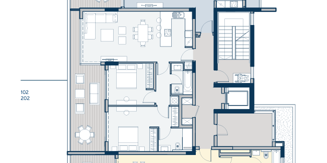 Each apartment in the complex is designed with maximum comfort in mind. The project includes an open-plan living room and kitchen and a covered veranda. The project provides for underfloor heating using a heat pump, an electric water heater and pressure system, photovoltaic panels connected to the electricity meter of each apartment, electric gates for access control to the territory, installation of one outlet for an electric car in each parking space, installation of outdoor video surveillance to cover the perimeter of the building on the ground floor and common areas, the entrance door is controlled by using a video intercom, a smart home system controlled by a touch panel and/or a smartphone or tablet, a security alarm system with motion sensors. Two parking spaces are allocated for three-bedroom apartments and one for two-bedroom apartments.