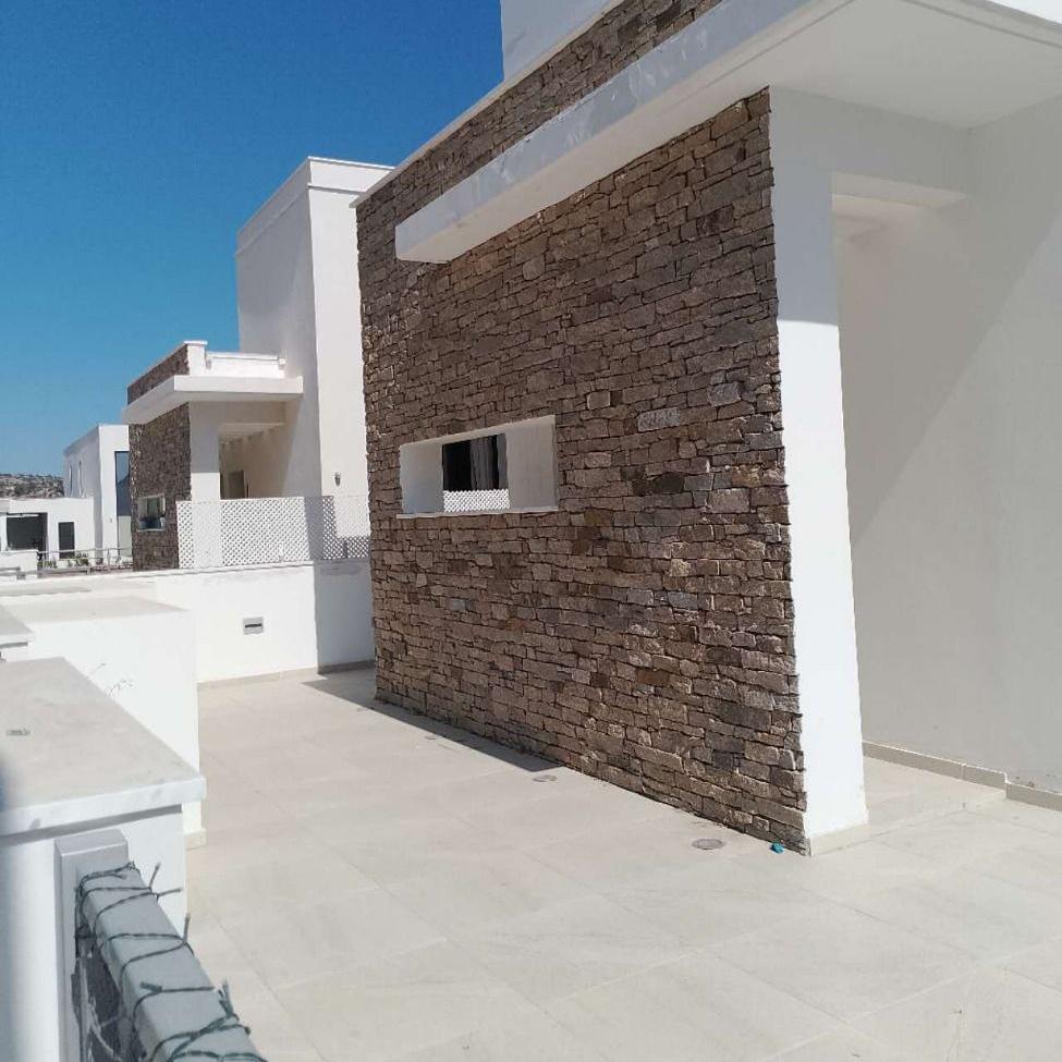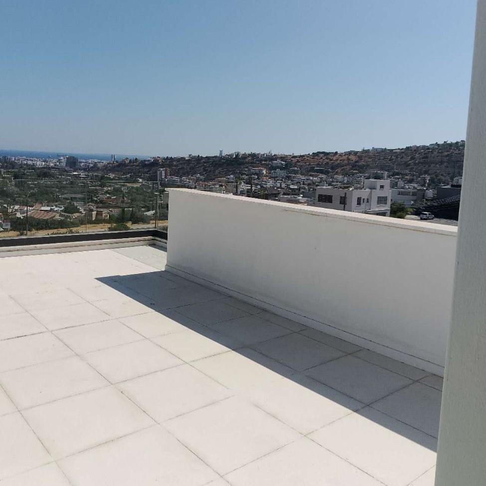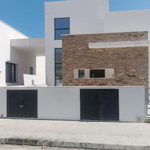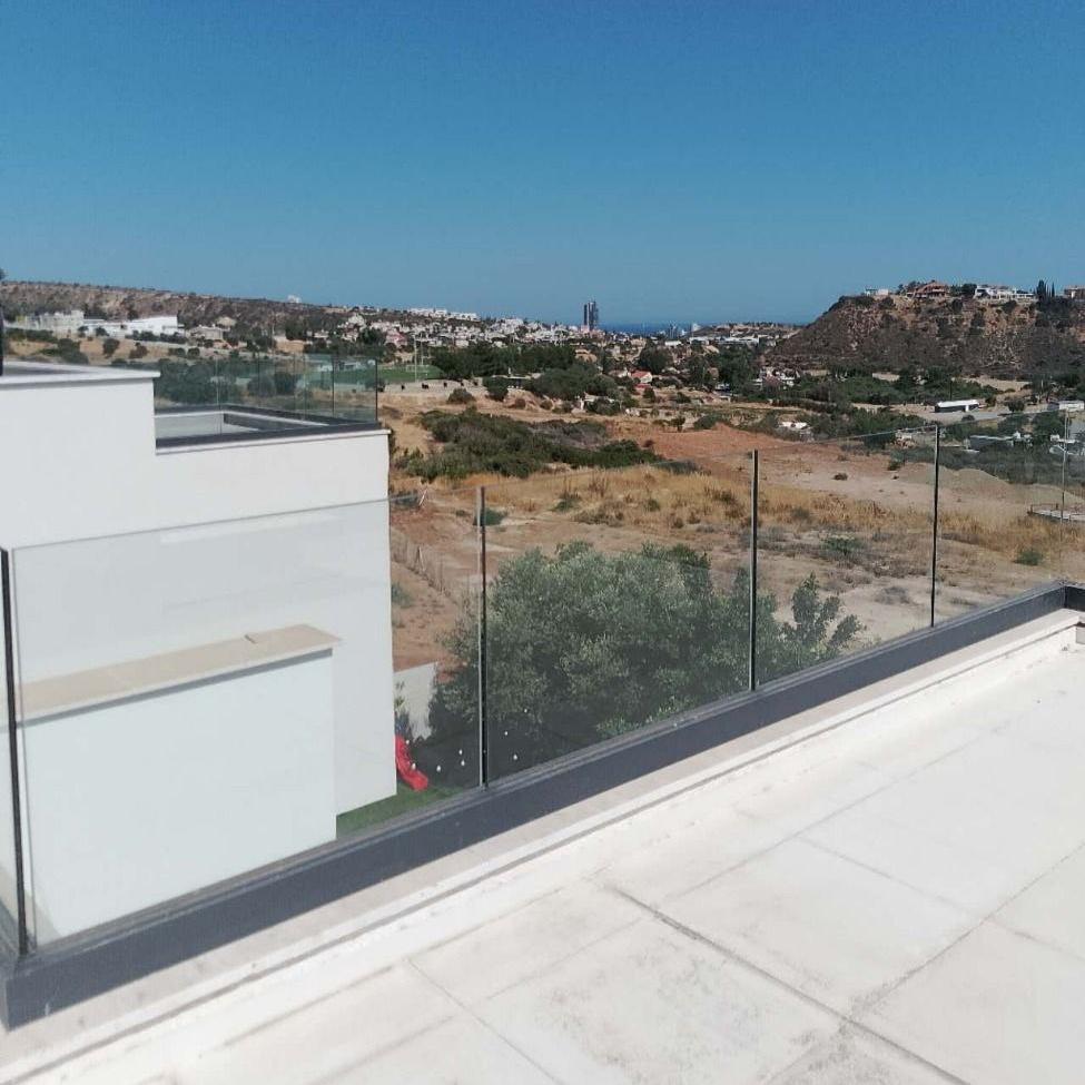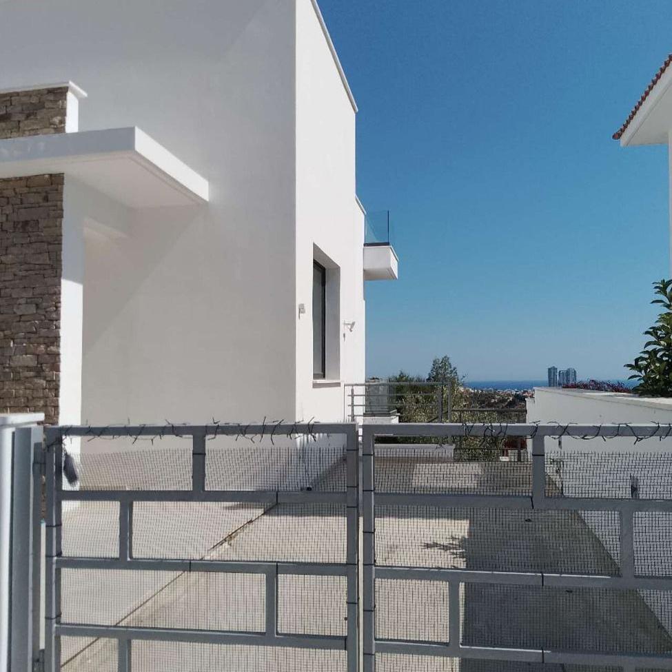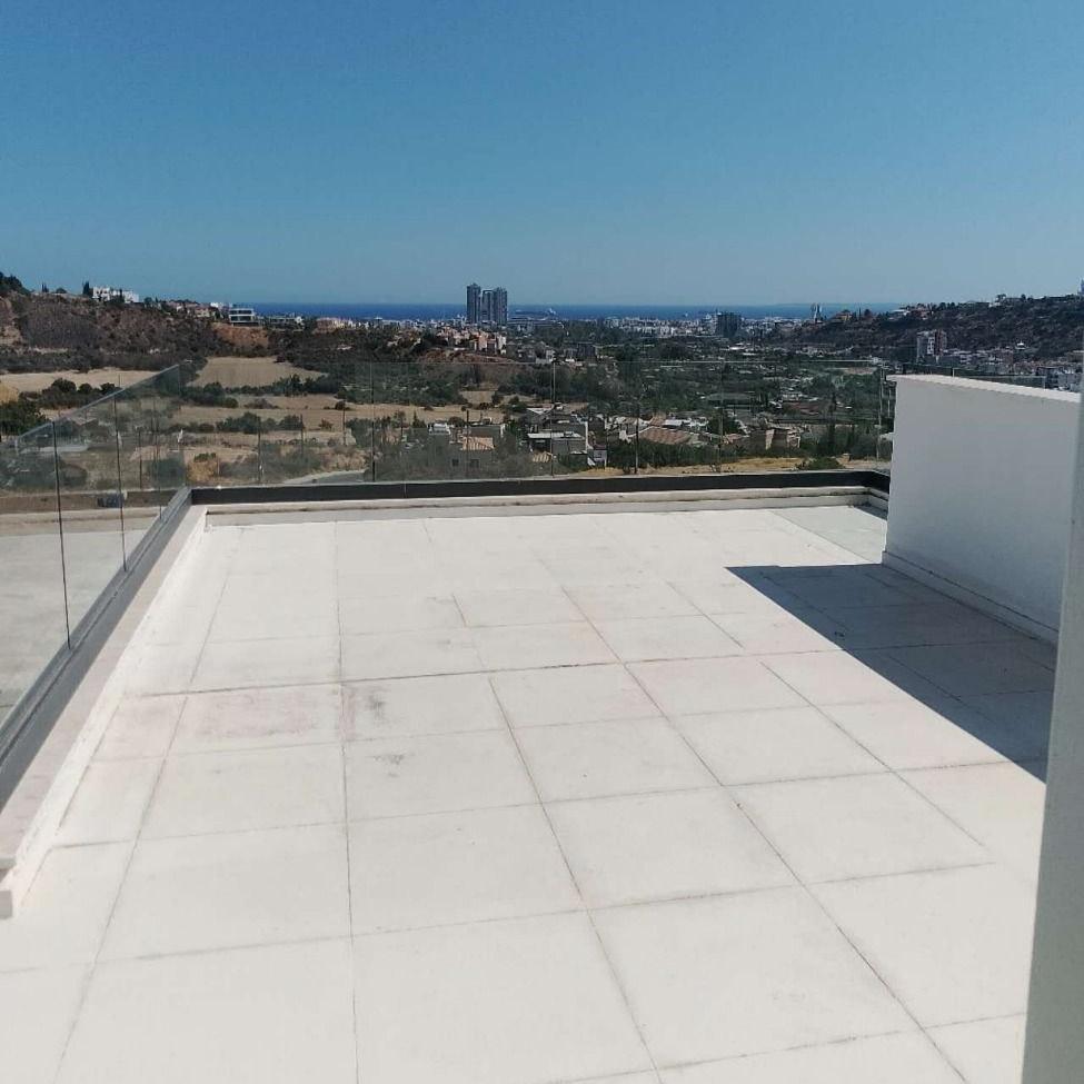 Modern two-bedroom villa for sale in Germasogeia, Limassol, with a total area of 225 m2, including a living area of 145 m2, a covered veranda of 9 m2, an open veranda of 6 m2 and a spacious roof garden of 68 m2. The land area is 372 m2. The villa consists of three levels: on the ground floor there is a living room combined with an open kitchen, a guest toilet and access to the garden, on the second floor there are two bedrooms and two bathrooms, and on the third level there is a roof terrace with panoramic views of the sea and the city.