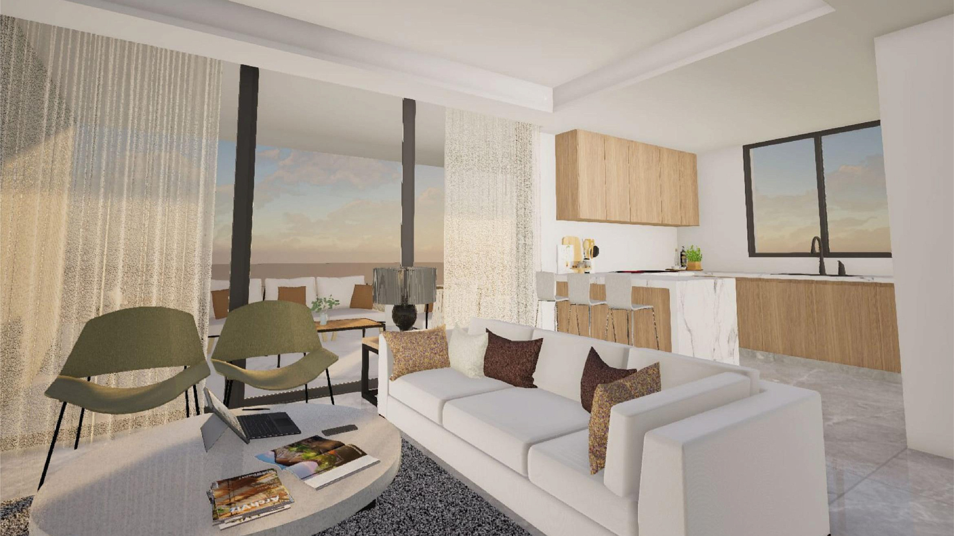 The living rooms in the complex are oriented to the south facing the sea and the park, the bedrooms to the west and east. The price includes underfloor heating, VRV air conditioning in the living rooms and split systems in the bedrooms, electric roller shutters on the windows. It is possible to install charging for an electric car and heated towel rails. The plumbing is flush-mounted, a hot water recirculation pump and a smart switch for the water heater are installed. A photovoltaic system is also provided for common areas.