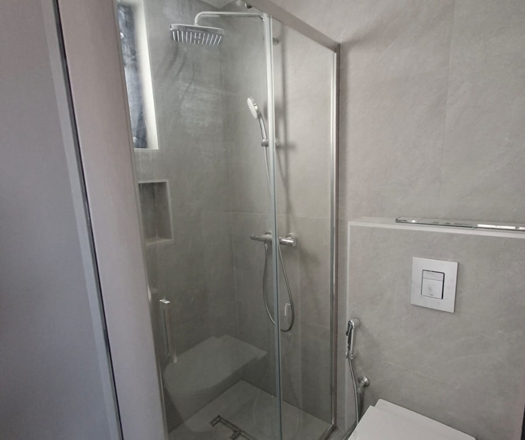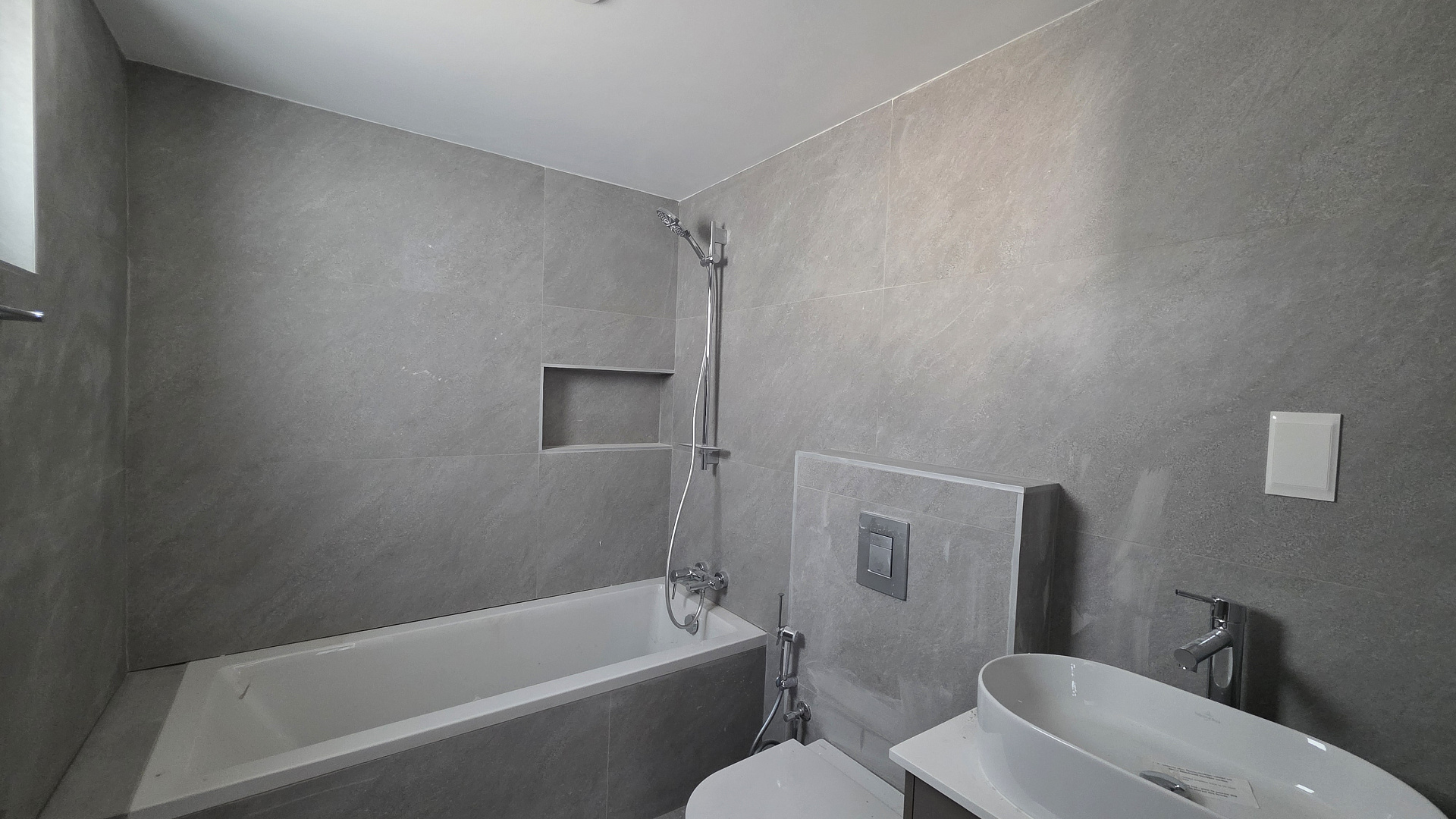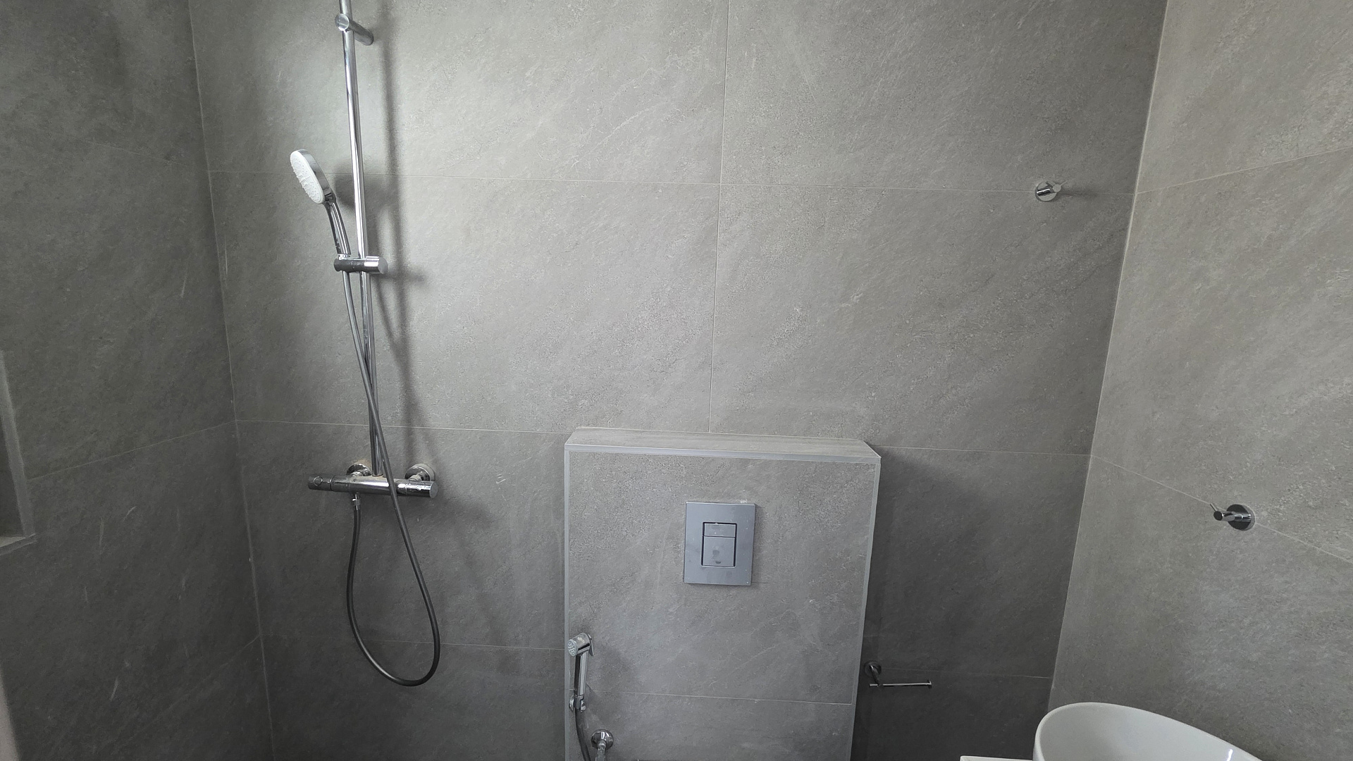 Premium plumbing from Laufen, Grohe and Villeroy & Boch is installed — bathtub, sinks, sanitary ceramics, faucets, shower systems, etc.