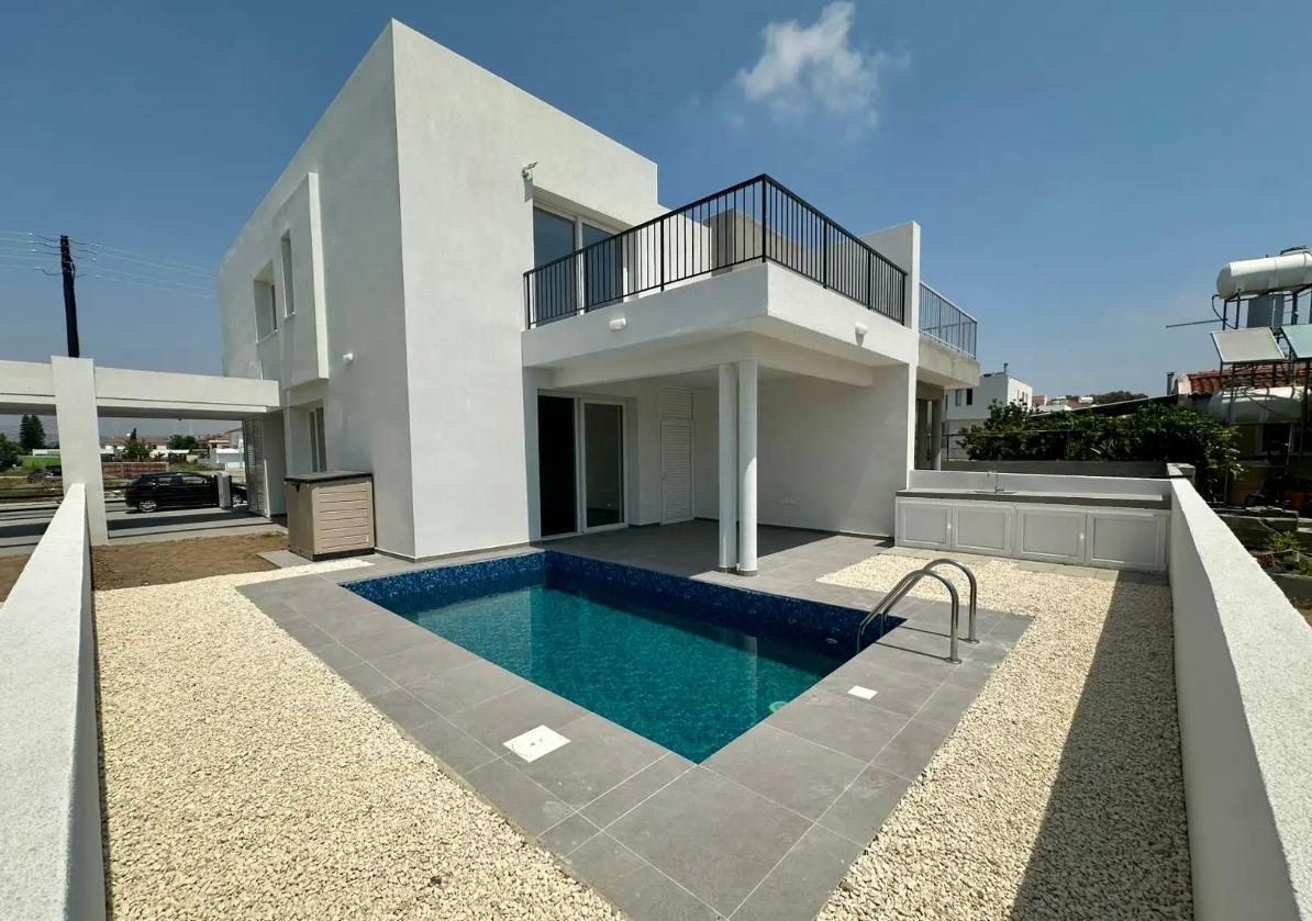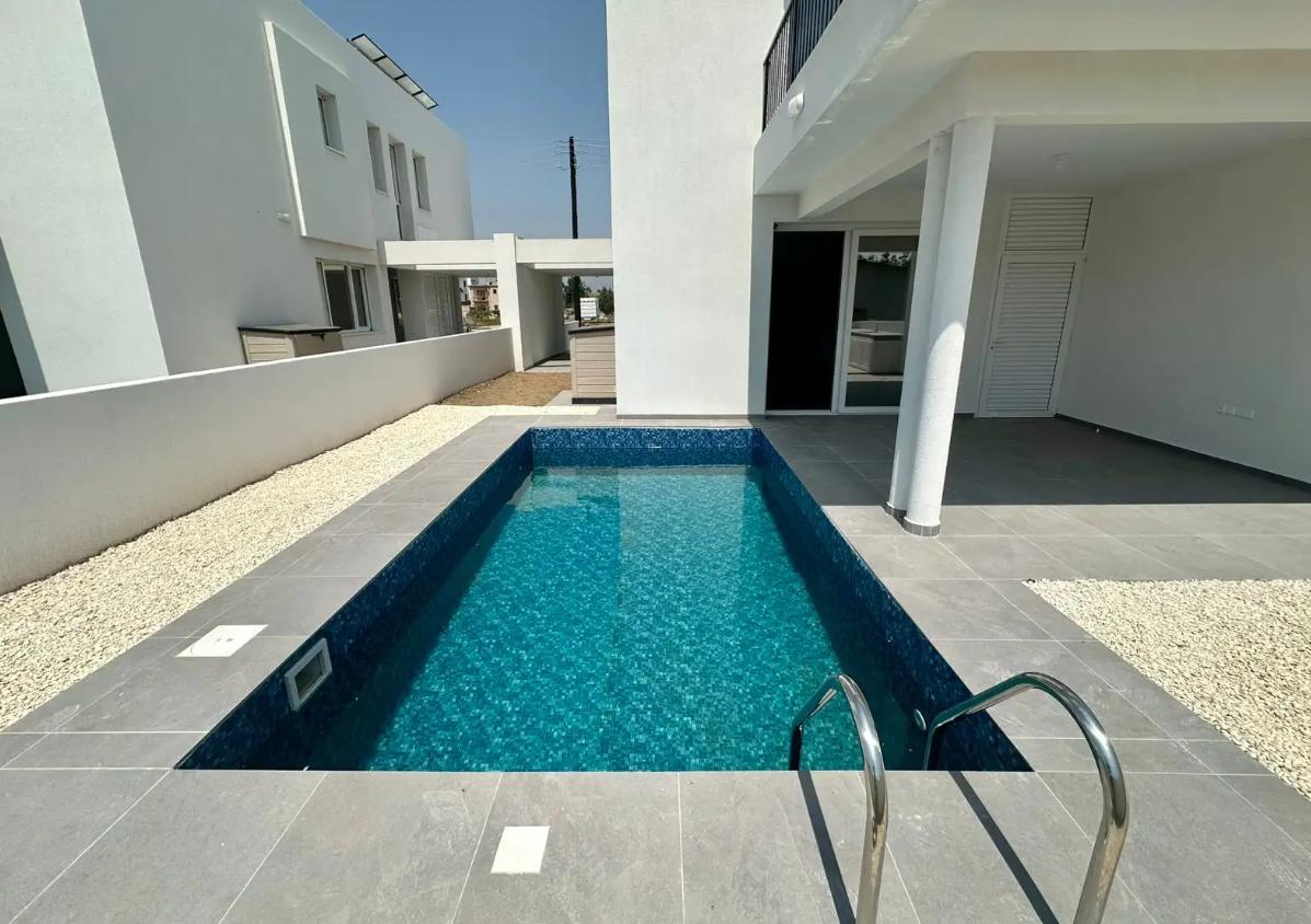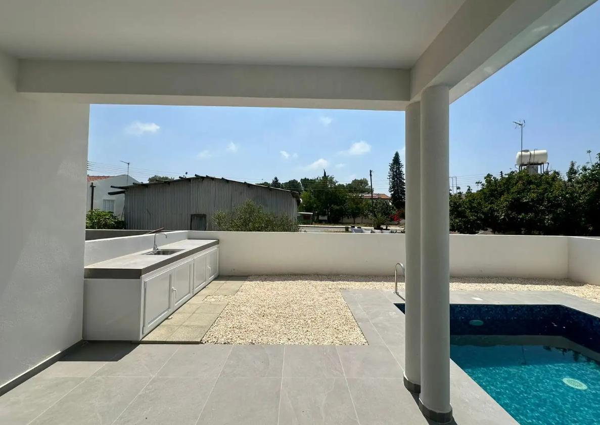 For sale a new three-bedroom house in the area of Kiti, Larnaca, with an area of 150 m2, located on a plot of 230 m2. The house has a modern design with an open plan, stylish kitchen with island, spacious bedrooms and large verandas. The property has a private swimming pool, garden, storage room and covered parking. The project will be completed in 2025. Excellent location — close to all amenities, the sea and the airport.