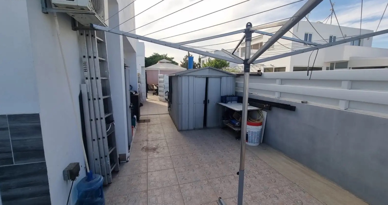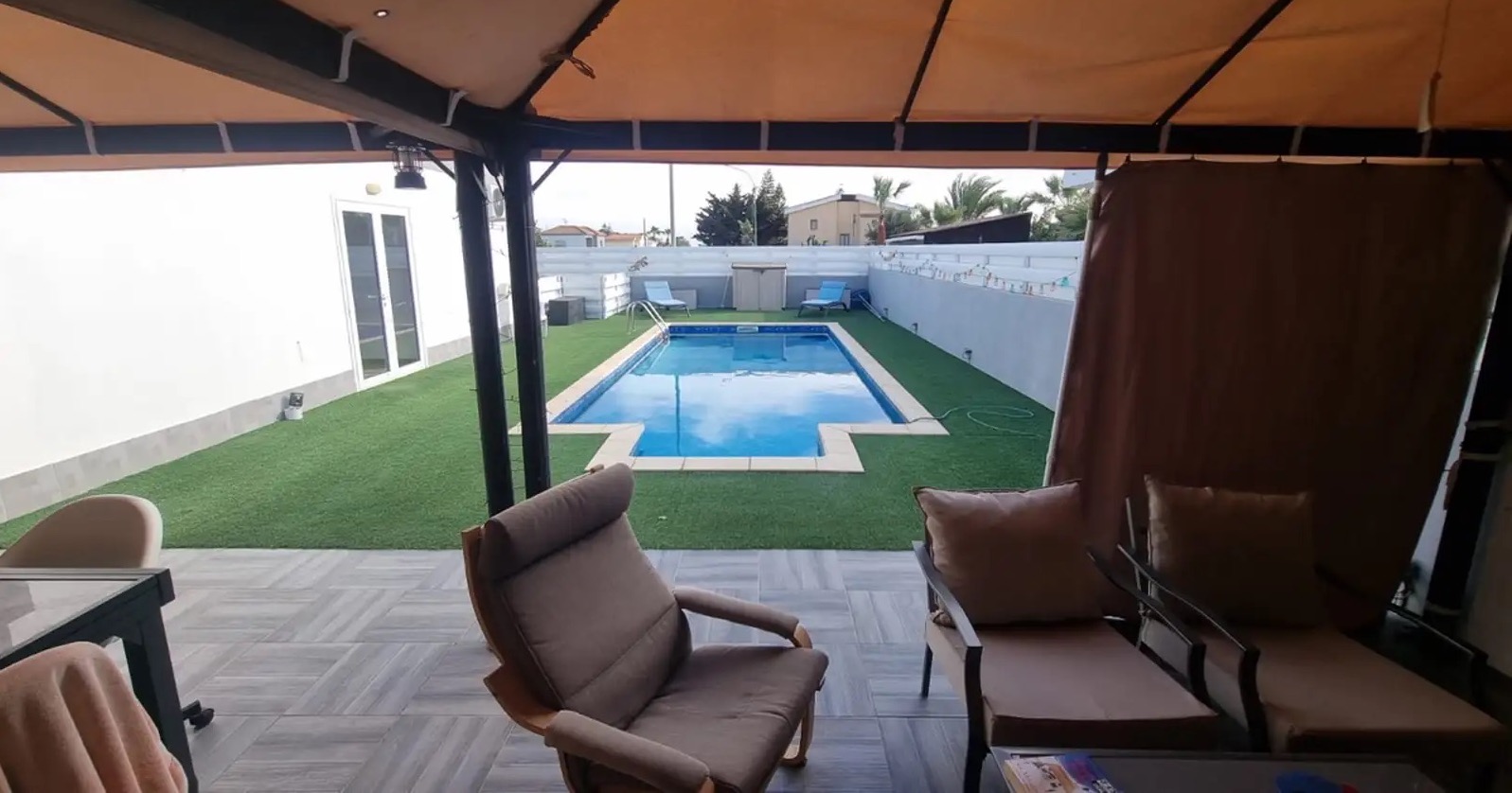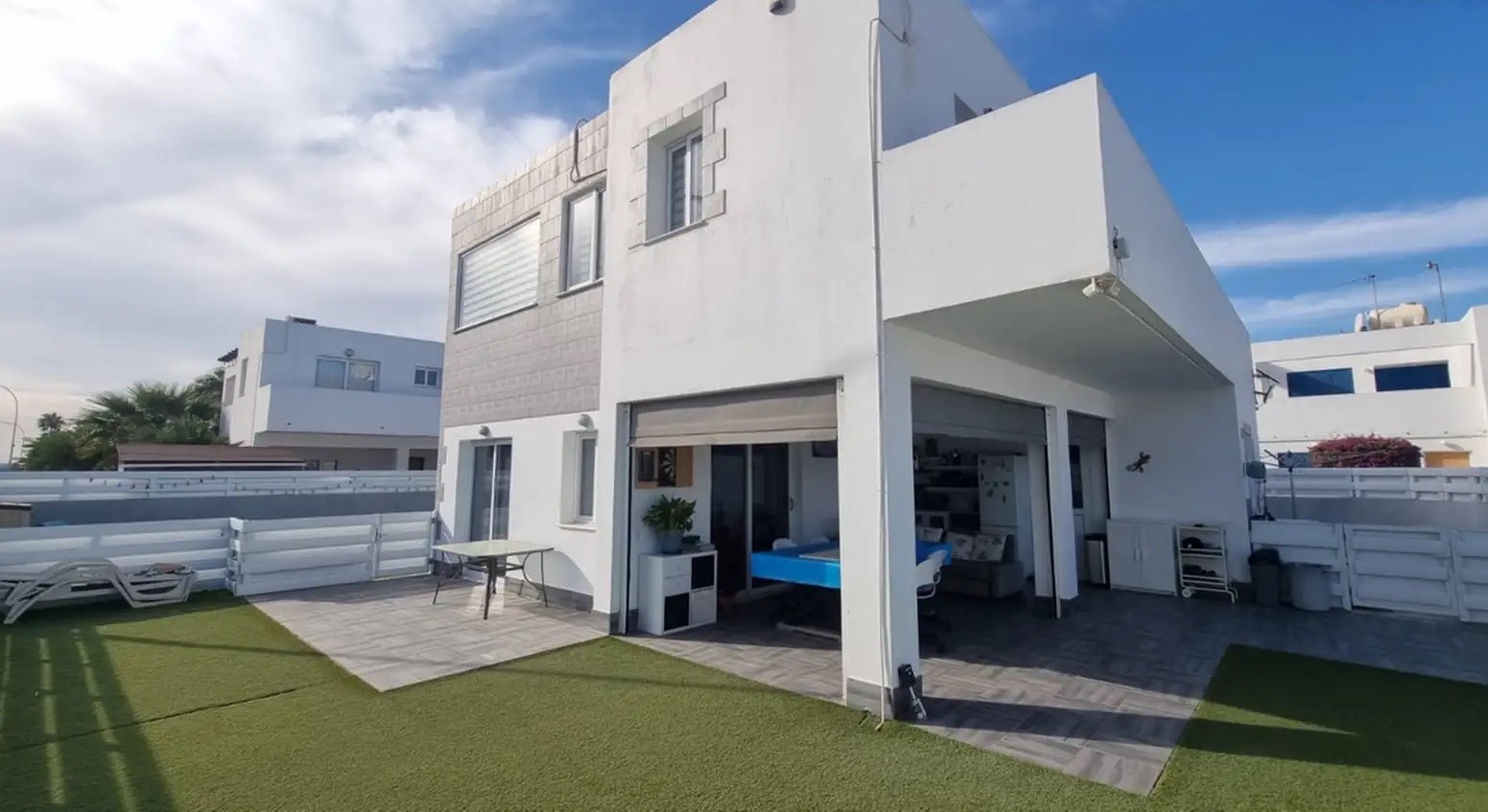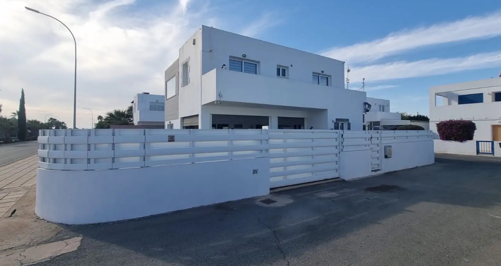 For sale a four-bedroom villa of 127 m2 on a plot of 400 m2 in Agia Thekla, Famagusta. The villa includes four bedrooms, three bathrooms, a kitchen, a living room, a balcony, a gym and a landscaped garden. The property is unfurnished. There is a private swimming pool, outdoor parking, and all communications are provided, including full air conditioning in all rooms. The villa was built in 2001. There is a title of ownership.