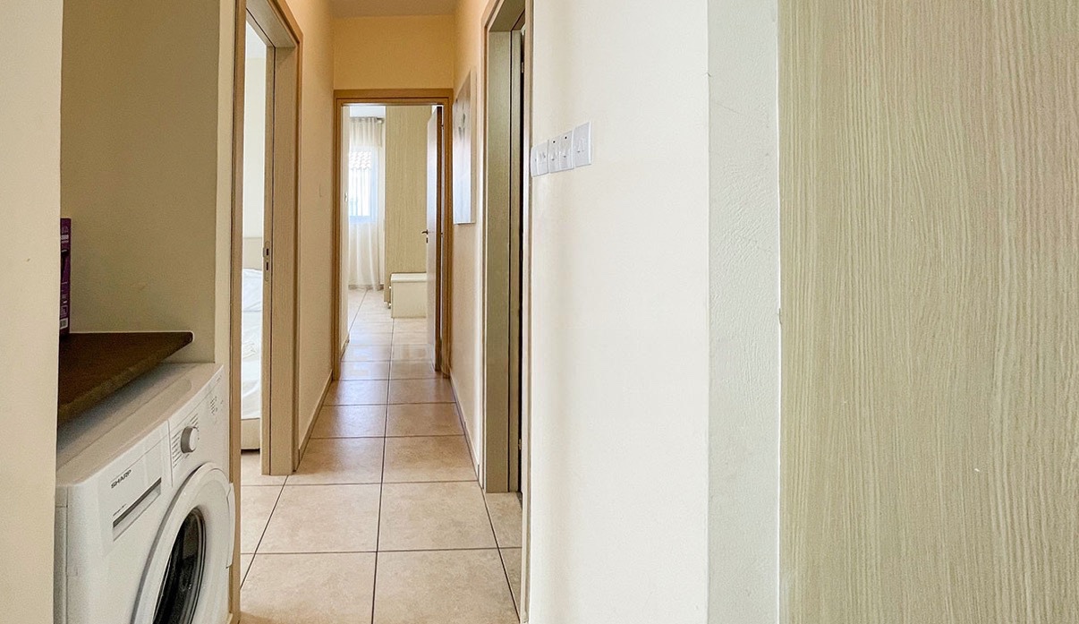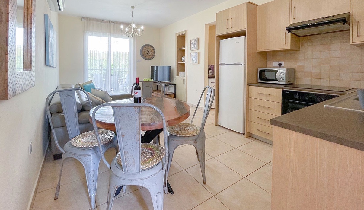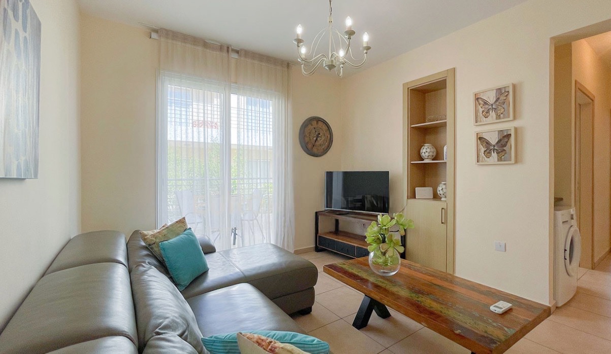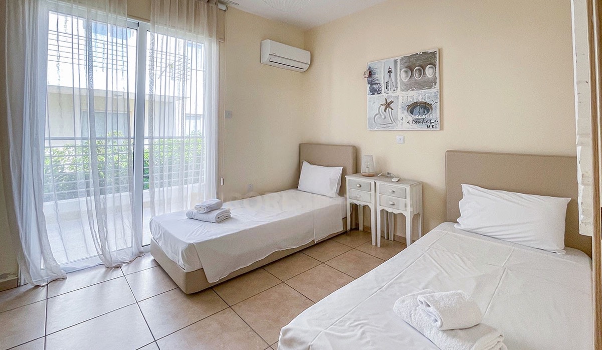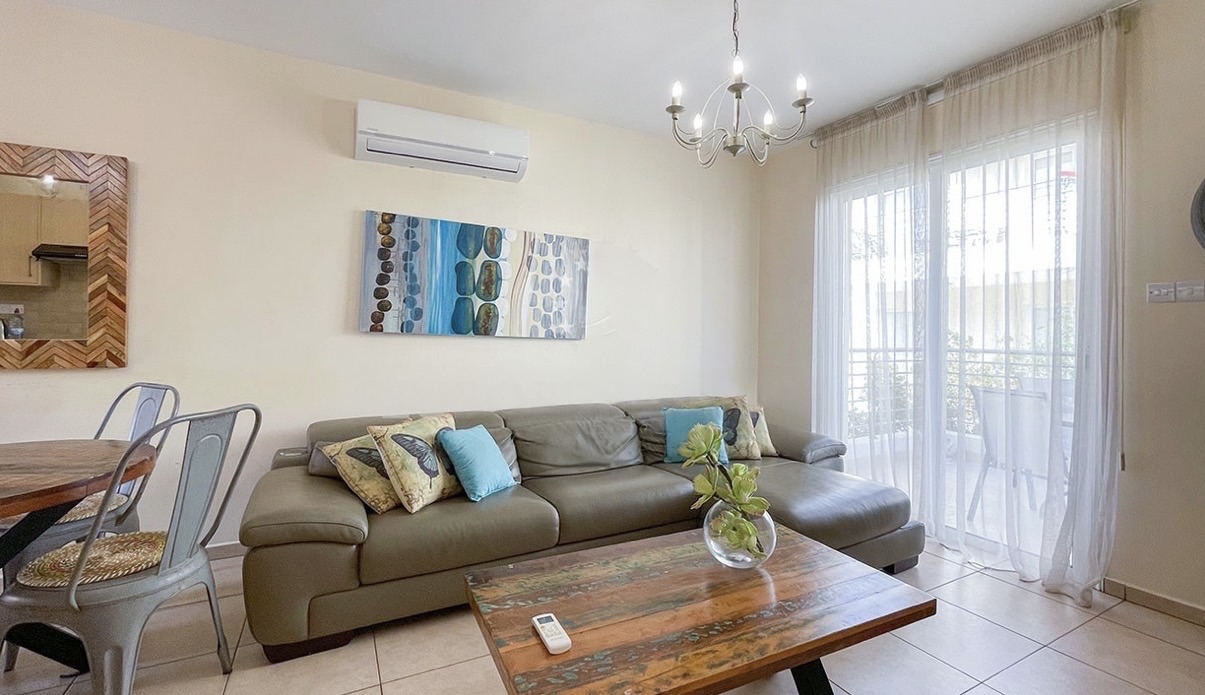Two-bedroom apartment of 90 m2 for sale in Kapparis, Famagusta. The apartment includes 2 bedrooms, 1 bathroom, 1 toilet, 1 shower room, kitchen, living room, large veranda, garden. The property is fully furnished and equipped with kitchen appliances; split air conditioning systems, an entrance safe door, energy-efficient windows and a solar water heater are installed. The apartment is located on the 1st floor. There is a swimming pool.The residence is located in a gated complex with covered parking, elevator, gym, playground and outdoor shower. The beach is within walking distance, and urban infrastructure and amenities are located nearby.