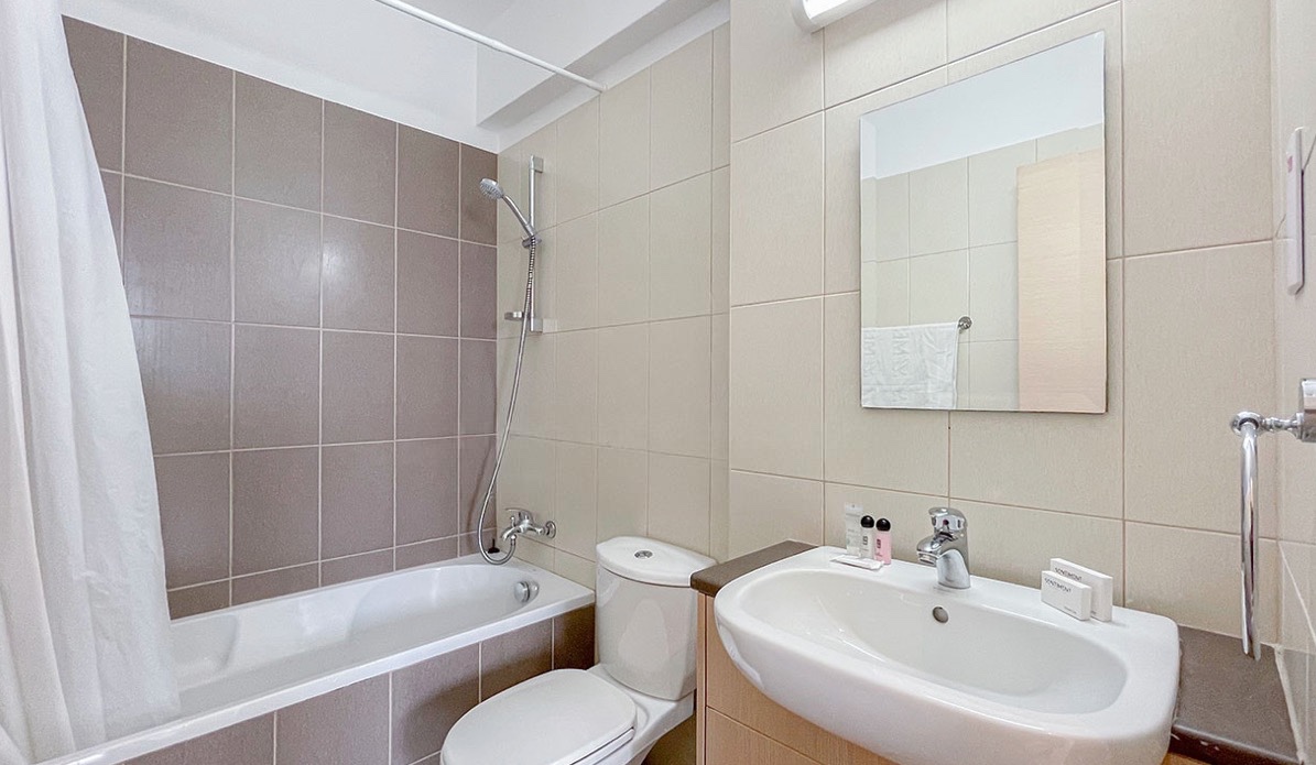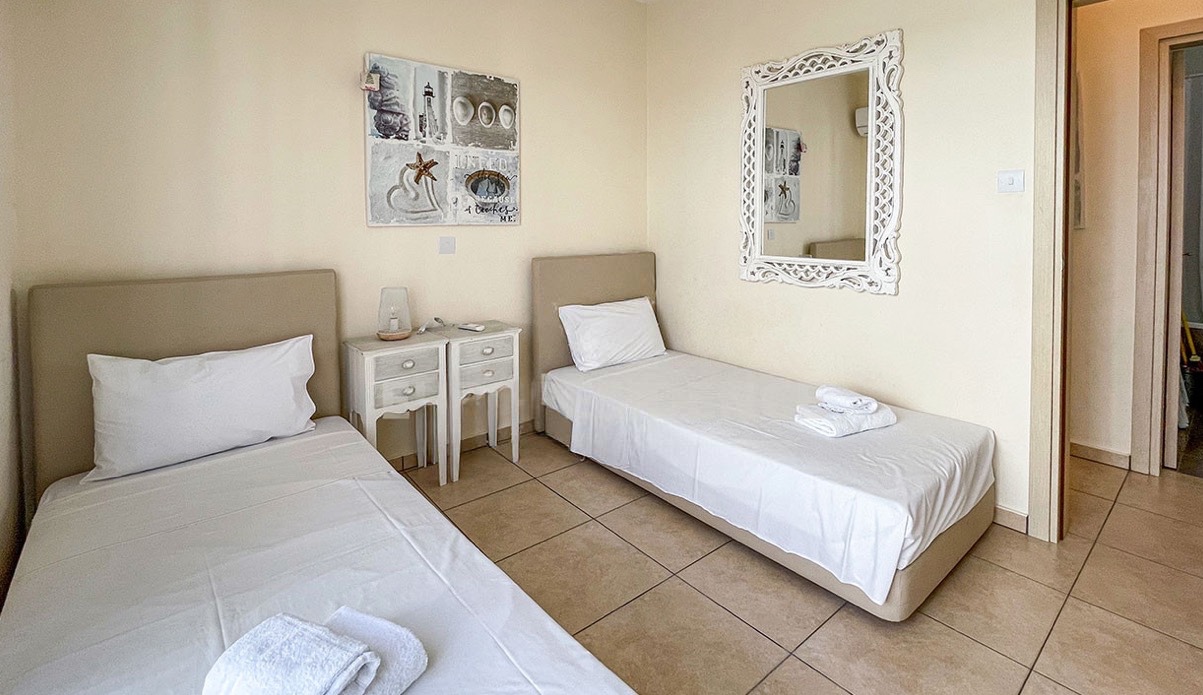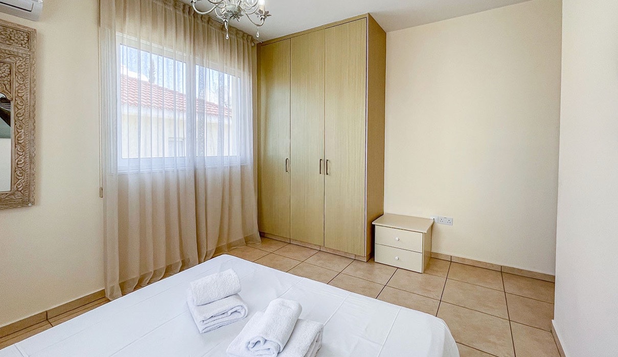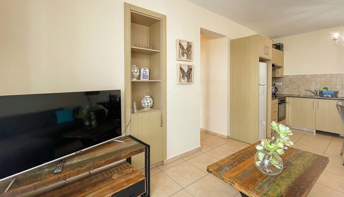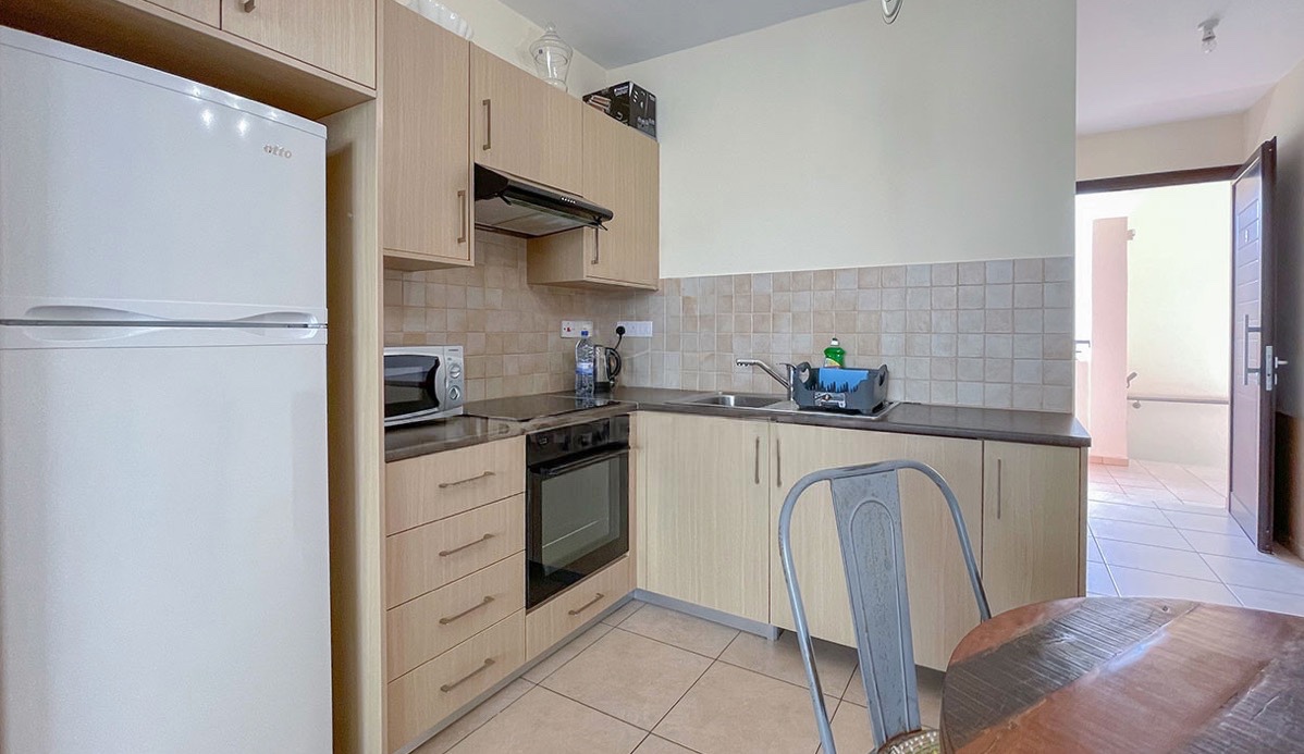 Two-bedroom apartment of 90 m2 for sale in Kapparis, Famagusta. The apartment includes 2 bedrooms, 1 bathroom, 1 toilet, 1 shower room, kitchen, living room, large veranda, garden. The property is fully furnished and equipped with kitchen appliances; split air conditioning systems, an entrance safe door, energy-efficient windows and a solar water heater are installed. The apartment is located on the 1st floor. There is a swimming pool.The residence is located in a gated complex with covered parking, elevator, gym, playground and outdoor shower. The beach is within walking distance, and urban infrastructure and amenities are located nearby.