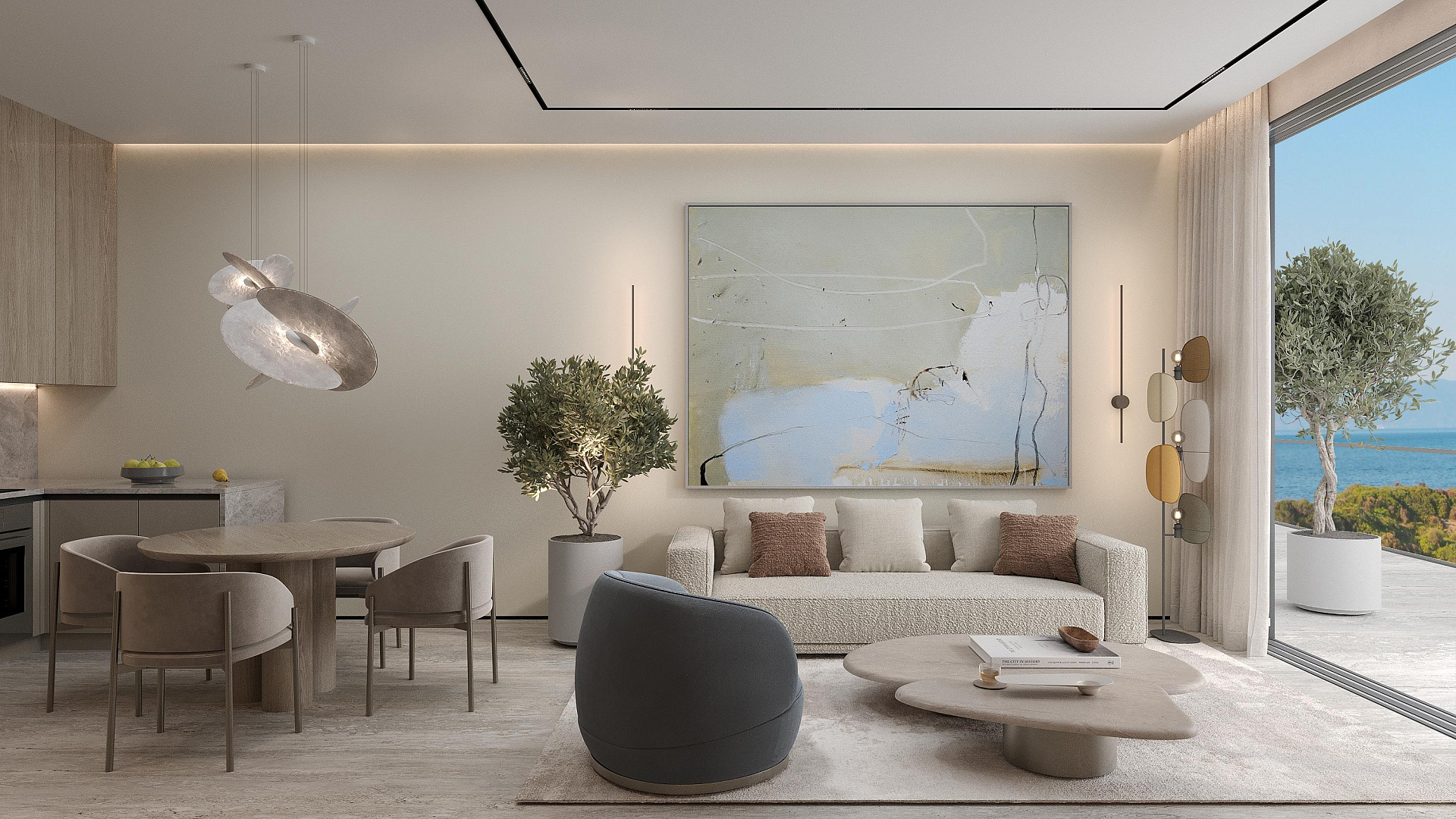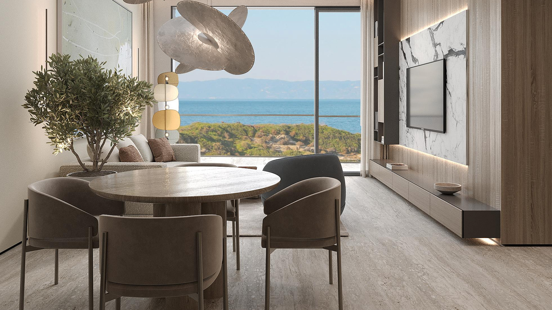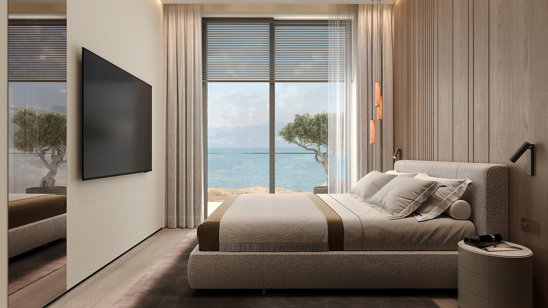Apartment for sale in a modern complex in Tala, Paphos. It is a boutique complex of 18 carefully designed apartments. At the entrance, you are greeted by a bright hall with built-in hidden storage systems, which leads to a spacious kitchen-living room, fully furnished with elegant furniture and equipped with modern appliances. Top-class finish: natural materials, spacious glass facades and sophisticated interior elements.