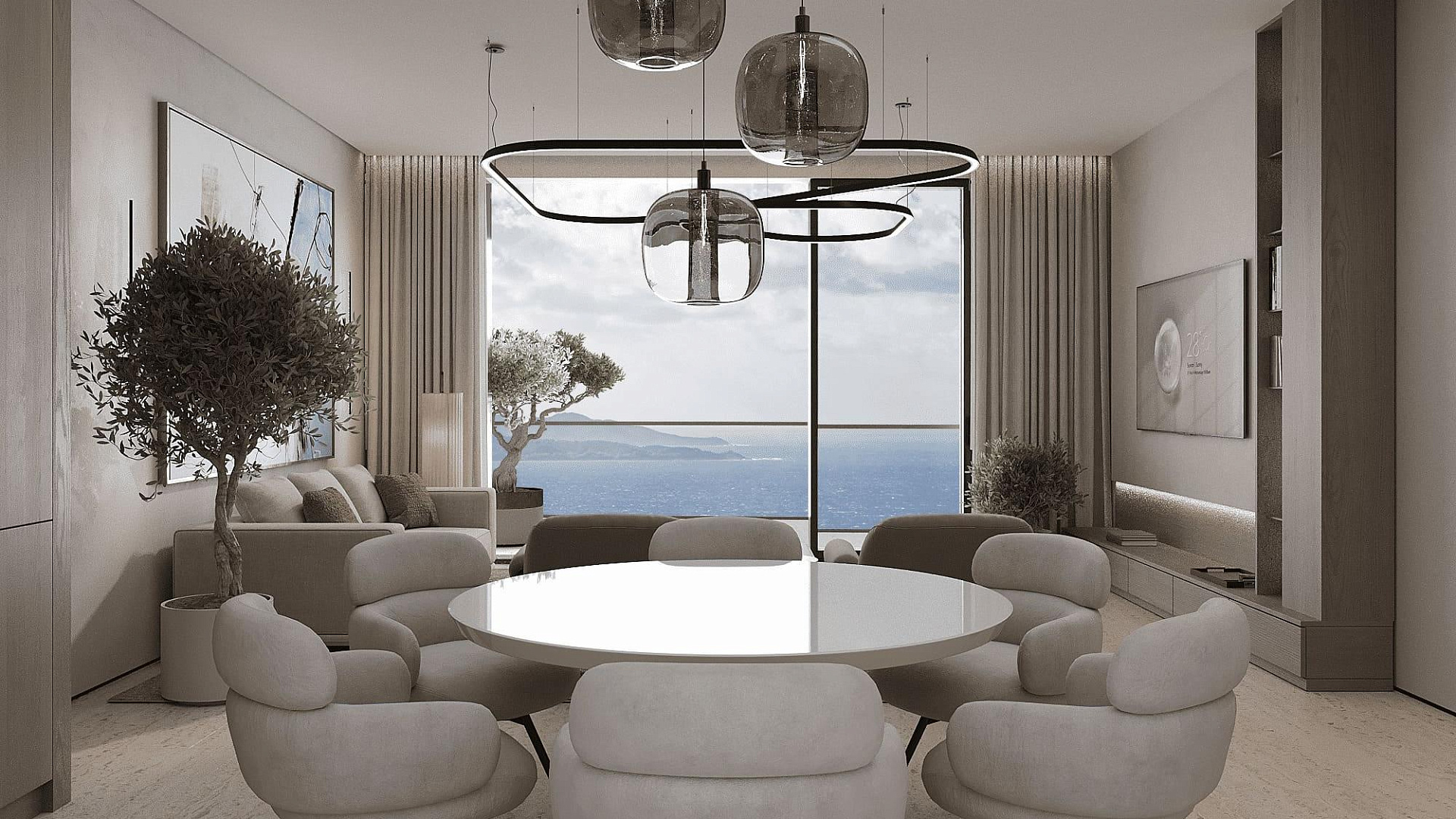 Apartment for sale in a modern complex in Tala, Paphos. It is a boutique complex of 18 carefully designed apartments. At the entrance, you are greeted by a bright hall with built-in hidden storage systems, which leads to a spacious kitchen-living room, fully furnished with elegant furniture and equipped with modern appliances. Top-class finish: natural materials, spacious glass facades and sophisticated interior elements.