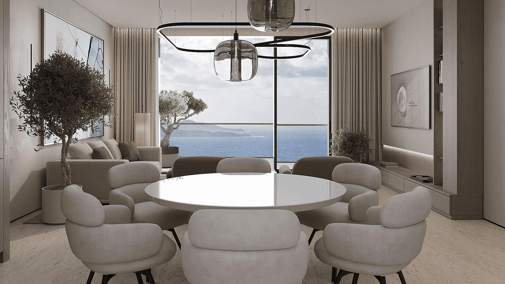 Apartment for sale in a modern complex in Tala, Paphos. It is a boutique complex of 18 carefully designed apartments. At the entrance, you are greeted by a bright hall with built-in hidden storage systems, which leads to a spacious kitchen-living room, fully furnished with elegant furniture and equipped with modern appliances. Top-class finish: natural materials, spacious glass facades and sophisticated interior elements.