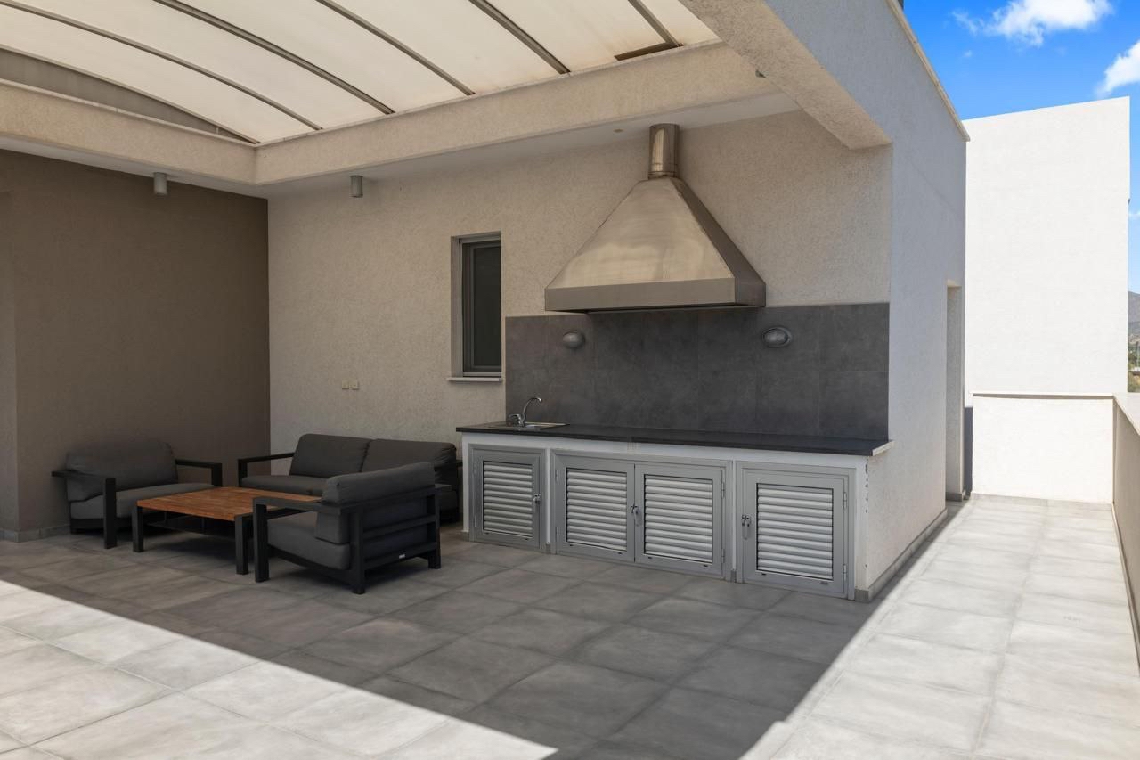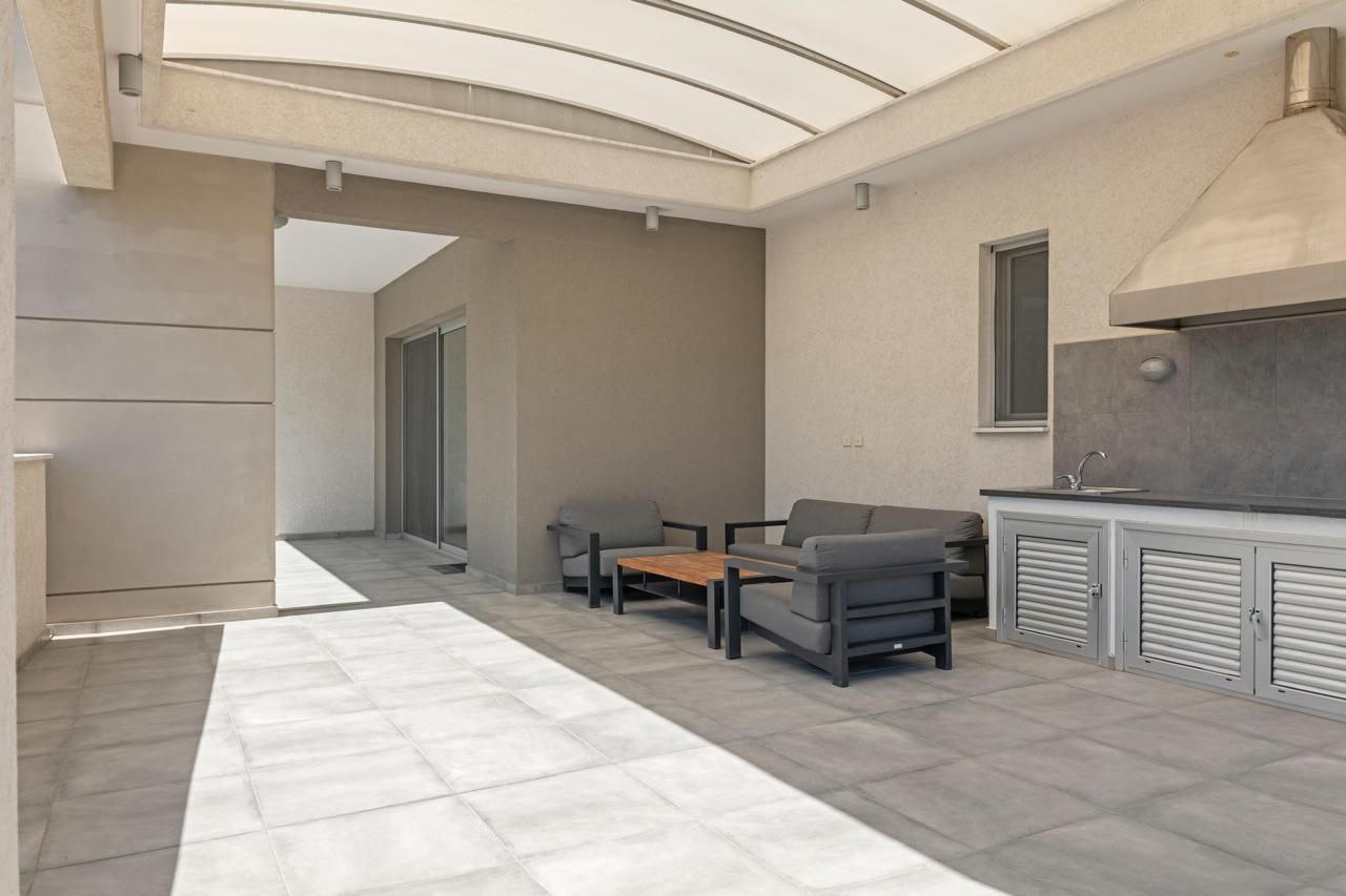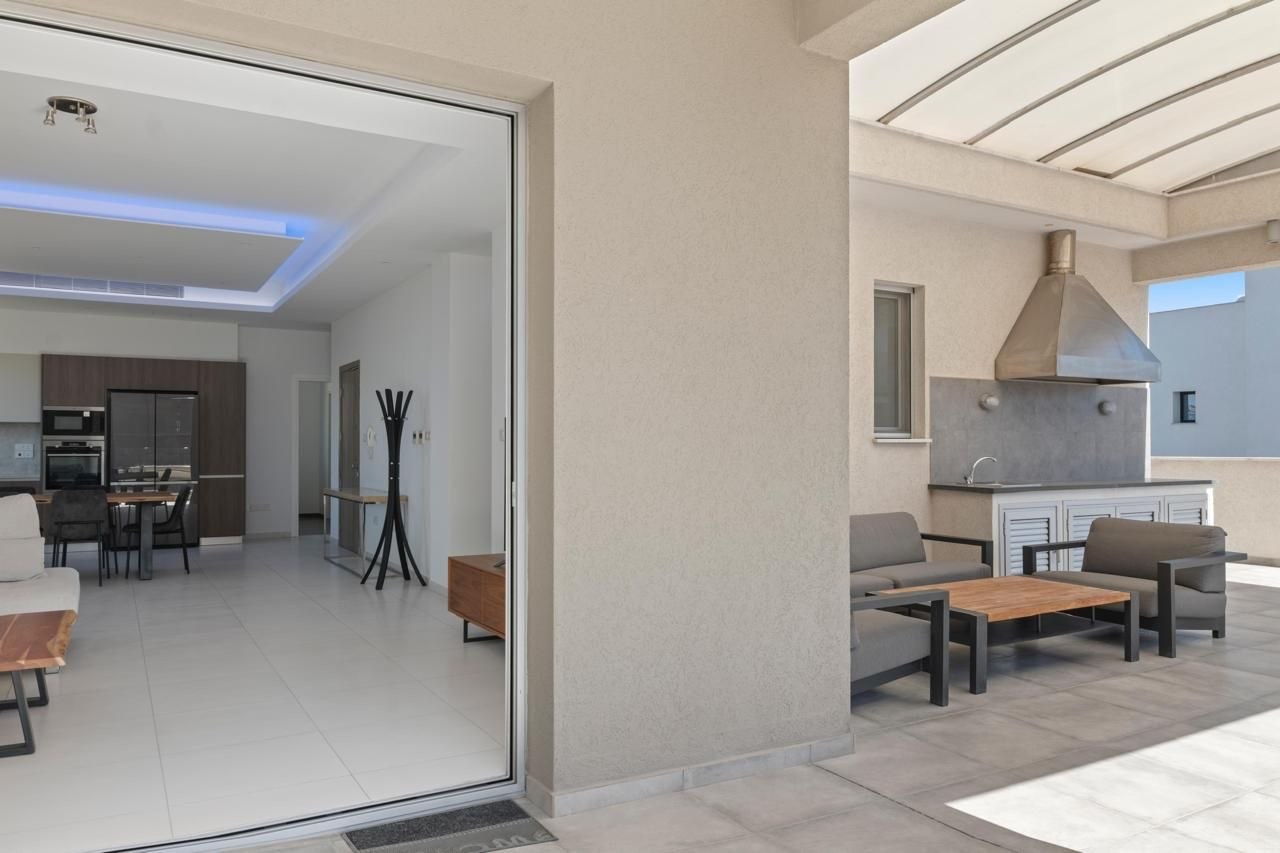 Three-bedroom penthouse of 232 m2 for sale in Potamos Germasogeias, Limassol. The penthouse includes three bedrooms, three bathrooms (guest bathroom, main bathroom with bathtub, master bedroom with shower), a spacious living room, an open-plan kitchen, a large veranda on one level of 108 m2 with a BBQ area, as well as a storage room that can be converted into a maid's room. The apartment is located on a separate floor. The property is fully furnished and equipped with individual concealed air conditioners in each room and underfloor heating system. The property has an enclosed and covered parking for 2+ cars with a private entrance. The facility is located in a modern low-rise building with only five apartments, which provides privacy and a peaceful living atmosphere. The penthouse is located on a quiet dead-end street about 800 m from the sea, within walking distance from the beach and the amenities of the area. The title of the property is available.