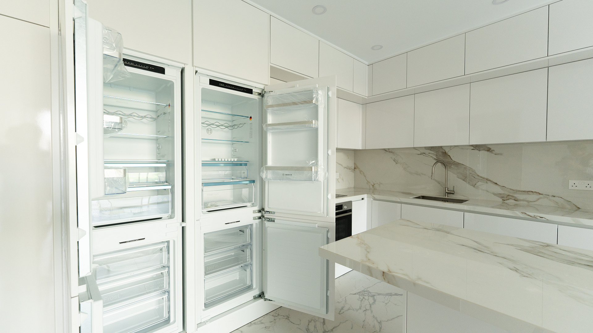 Modern 2-bedroom apartment is available from March 2026, it includes all Bosch appliances - 2 refrigerators, dishwasher, cooktop, range hood, oven, washer+dryer, upgraded finishes and bide showers in the washrooms. Located in the prestigious Tombs of the Kings area, Paphos. Modern residential complex includes a common pool, covered parking and storage room.