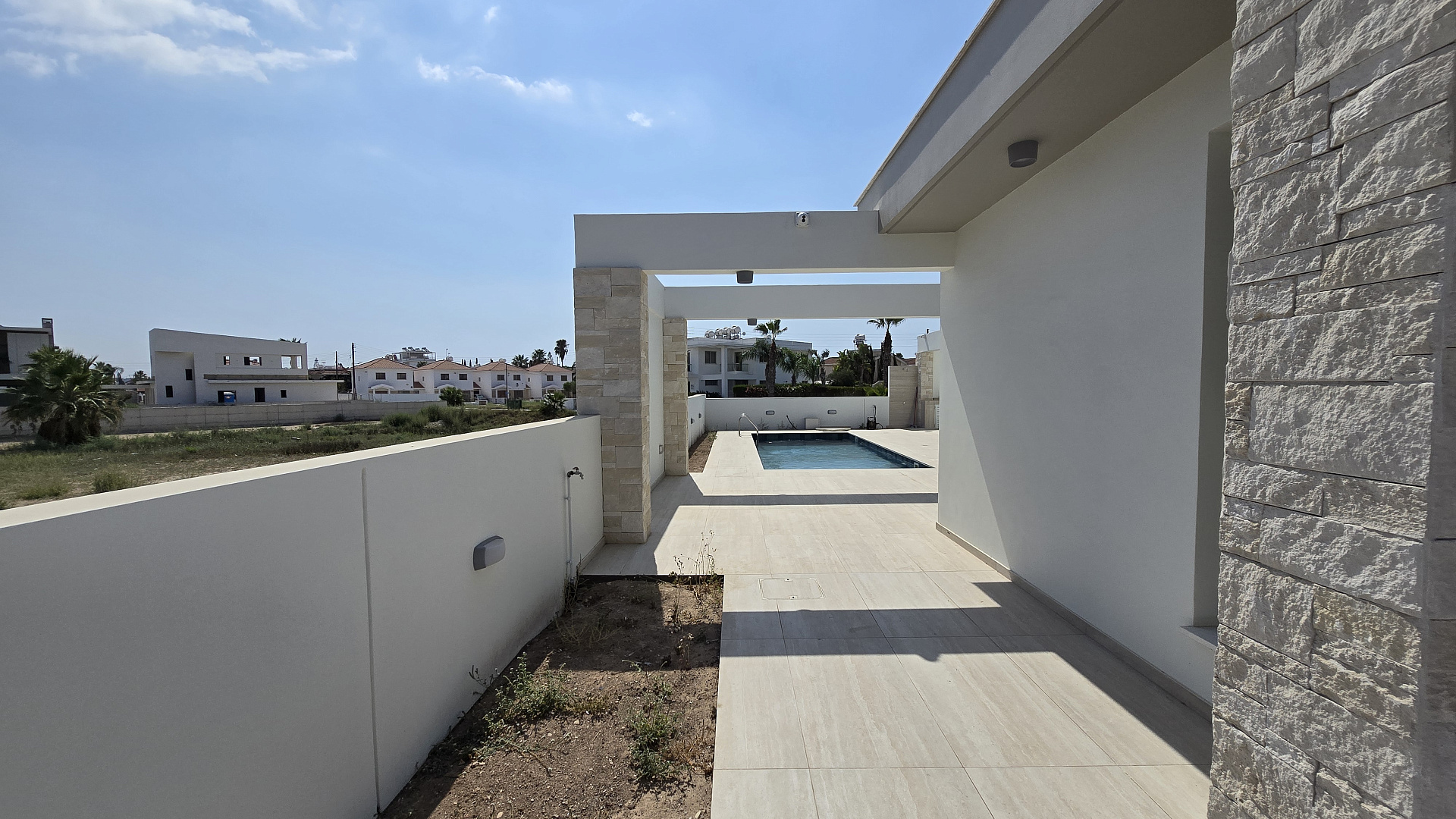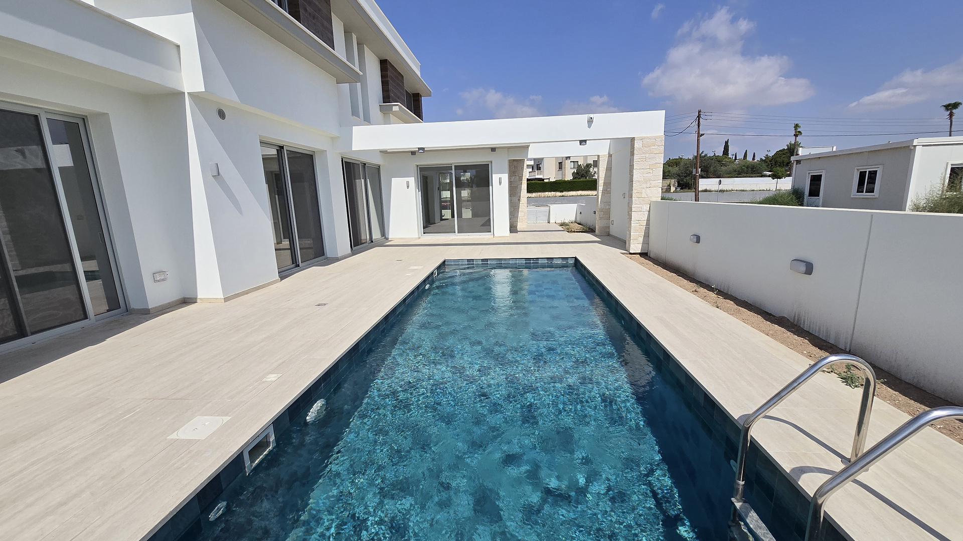 Exclusive villa for sale in the tourist area of Pyla, Larnaca. With 3 luxurious bedrooms and 3 modern bathrooms, one bedroom on the first floor and 2 bedrooms on the second. Upon entering, you will be greeted by the welcoming atmosphere of the open living room, where the Italian built-in kitchen harmoniously combines with the guest room. The comfort level in the villa is supported by modern amenities such as household appliances, a smart home system, air conditioners, double glazing with mosquito nets and central heating. The water pressure system provides reliable access to water, and photovoltaic panels reduce energy consumption and make the house more environmentally sustainable. The spacious terrace and barbecue by the pool provide an ideal place to relax. For practicality, the villa offers a storage room and a covered parking for 2 cars. Extensive landscaping. The villa is located within walking distance from the sea and all necessary infrastructure facilities. Just a few minutes to the road junction.