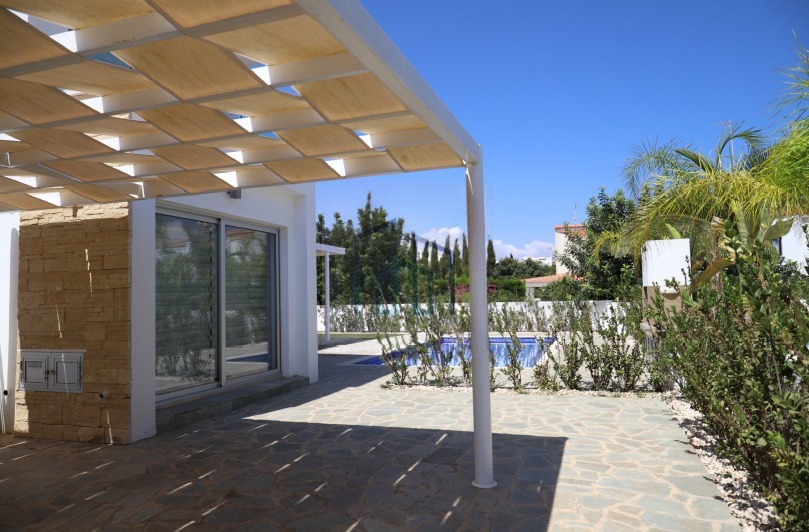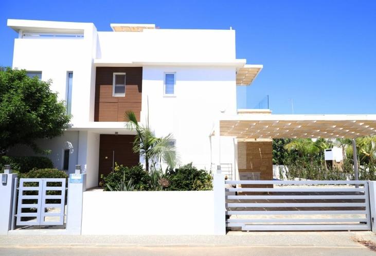 Four-bedroom villa for sale in Cape Greco, Famagusta, located in the prestigious gated resort complex Cavo Greko, within walking distance from the sea. The villa has an internal area of 192 m2 and a total area of 257 m2, located on a plot of 461 m2. The house offers a comfortable layout with an open-plan living and dining area, a fully equipped kitchen and a bedroom on the ground floor. On the second floor there are two bedrooms with private bathrooms and balconies with panoramic sea views, and on the lower level there is a fourth bedroom, a bathroom and a spacious storage room. There is a well-maintained garden with fruit trees, a private swimming pool, outdoor shower, barbecue area, roof garden with panoramic views and covered parking under the pergola.