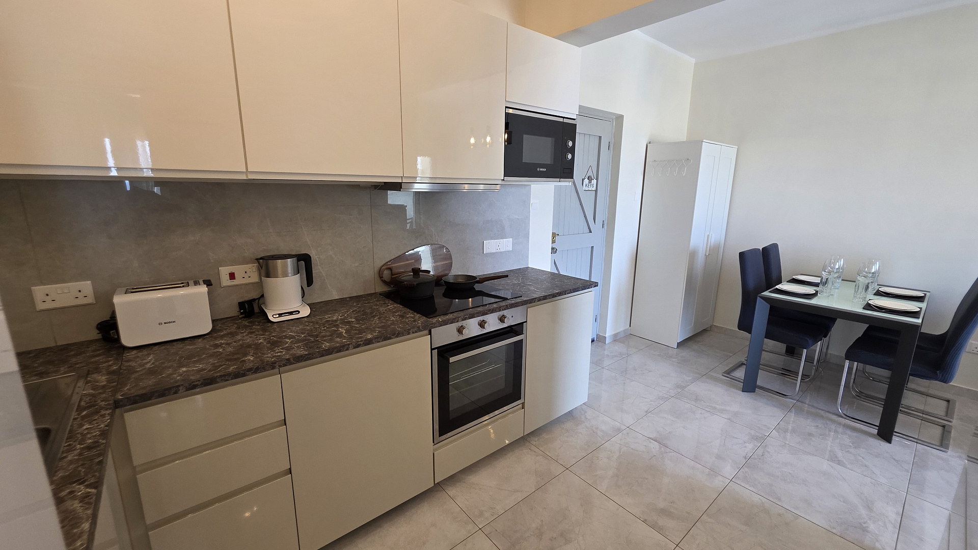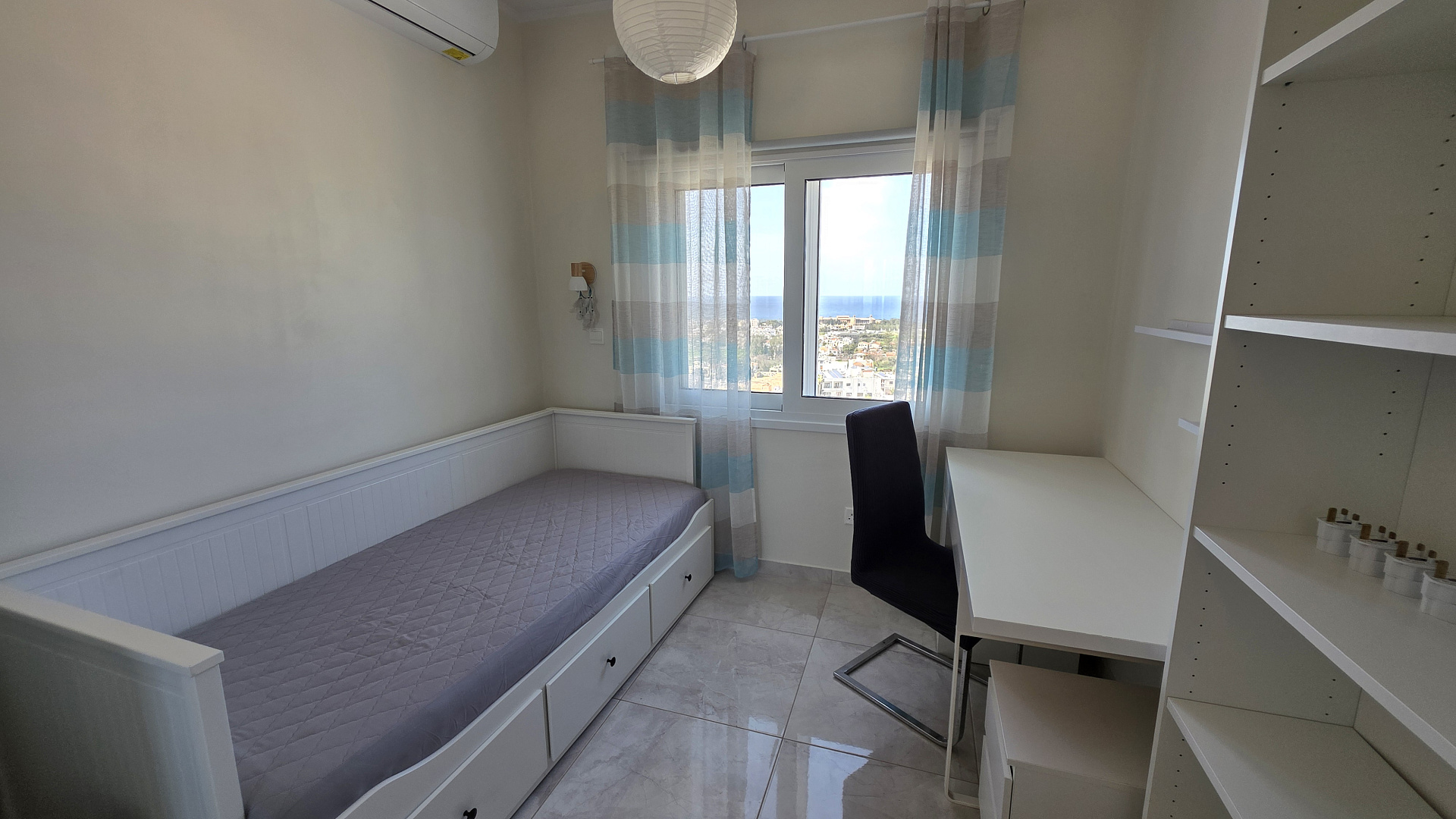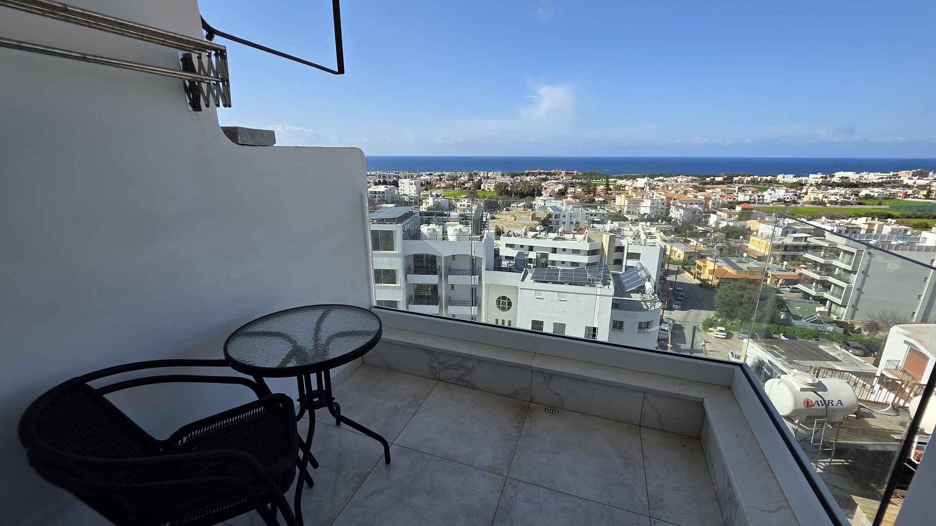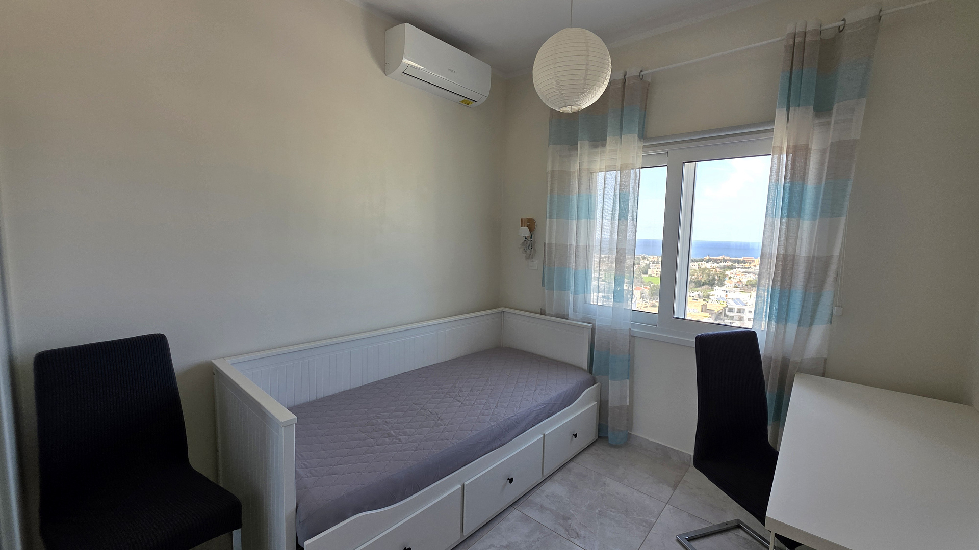 Two-bedroom apartment for rent in Universal area, Paphos with a total area of 61 m2 with panoramic sea and city views. The apartment is bright, warm and recently completely renovated. It is located in the center of Paphos, within walking distance of coworking spaces, cafes and restaurants, which makes it convenient for both comfortable urban life and remote work. The apartment is fully equipped with new household appliances, including a dishwasher, washing machine and dryer, modern inverter air conditioners, a drinking water filtration system and pumps for stable water pressure. New bed linen, blankets, pillows and textiles are provided, the apartment is ready to move in from the first day, photovoltaic panels are also installed to reduce energy costs. The house was built in 1998, but the facade has been renovated, and the renovation plan is 1.5 years old.