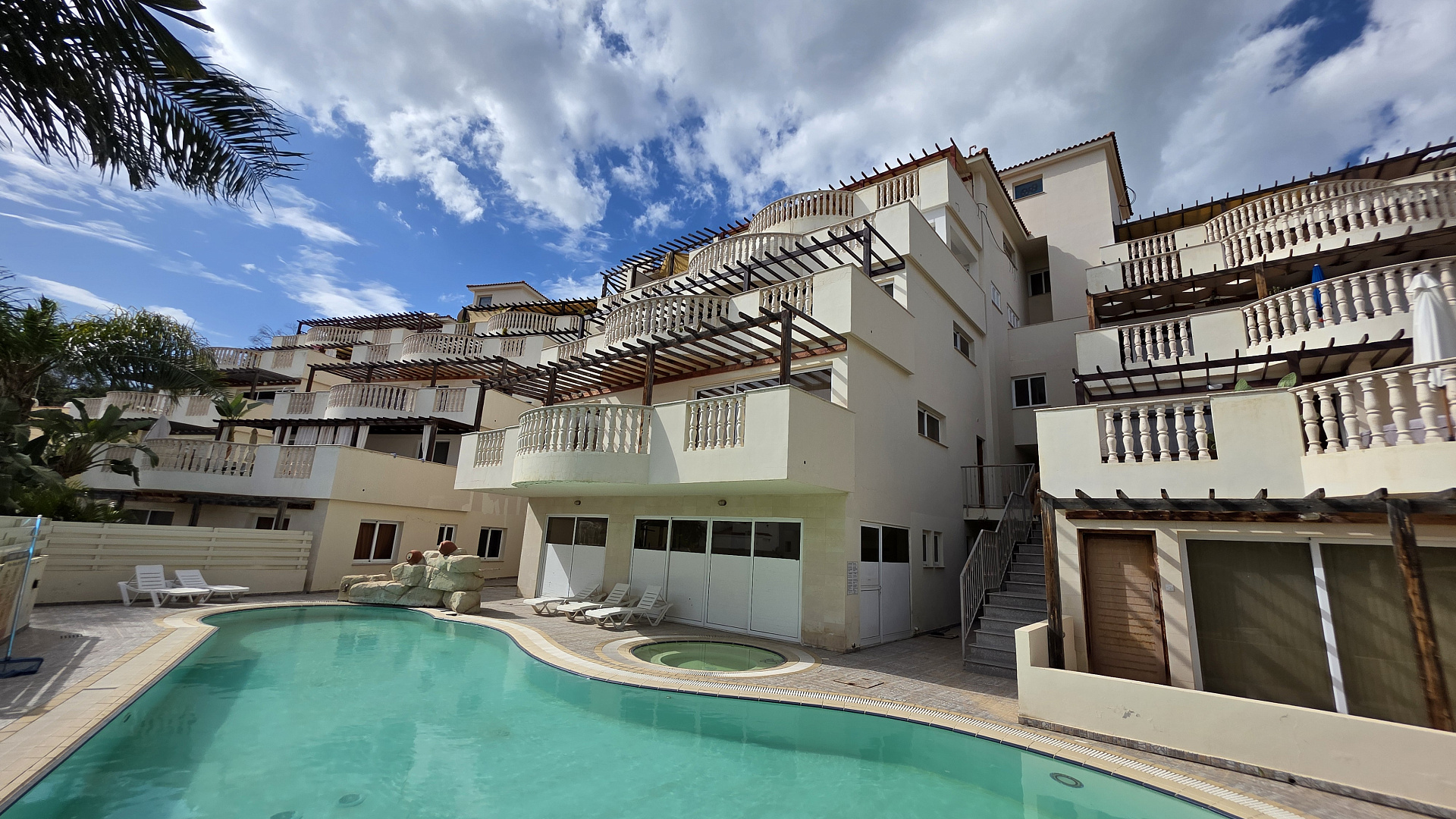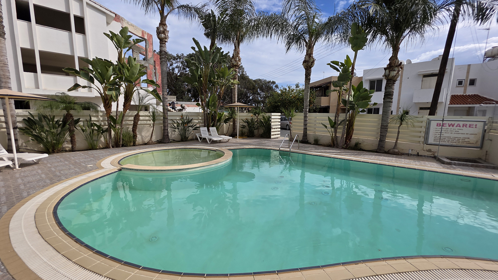 Two bedroom apartment for sale in Oroklini, Larnaca. The apartment is located on the ground floor of a residential building built in 2012 in a quiet part of the city and has been completely renovated. The total area is 141 m2 and includes two bedrooms and two bathrooms. Air conditioners are installed in all rooms. The apartment includes a balcony, a storage room and a covered parking space. A swimming pool, a garden, a gym and a sauna are provided for residents. The apartment is sold with the right of ownership and is ready to move in.