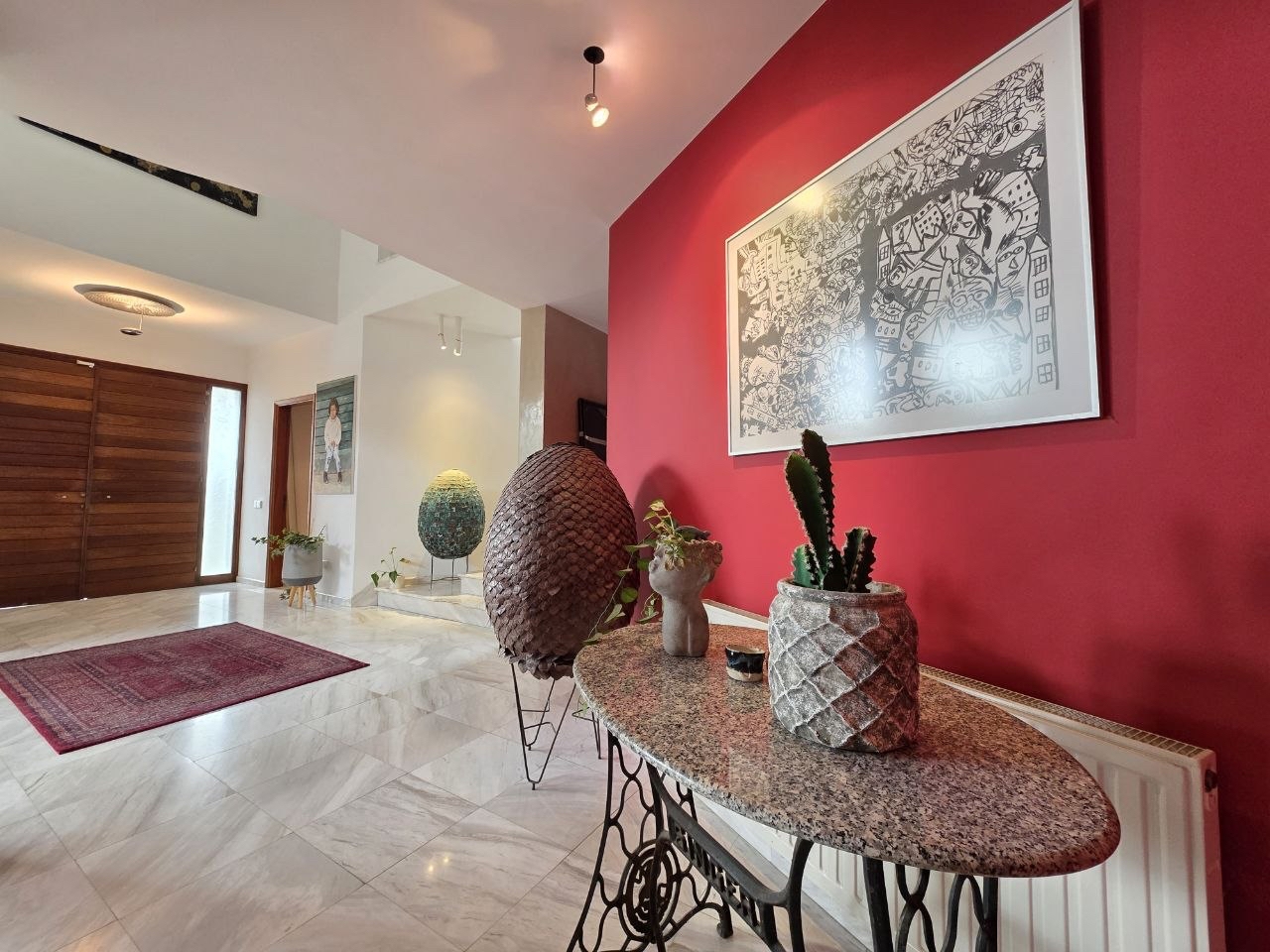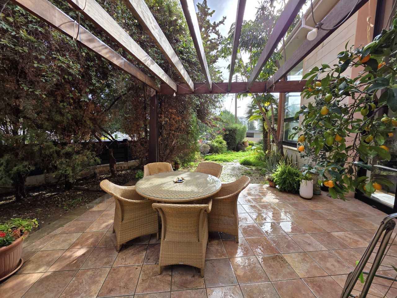 4 bedroom house for sale in Germasogeia, Limassol. The house consists of three levels and has access to the garden from the kitchen and two living rooms. At the entrance area level there is a living room with panoramic windows and access to the garden, a separate large kitchen combined with a small living room equipped with a fireplace, a guest toilet with a bathroom and a shower, and a bedroom that can serve as an office, an additional bedroom for family members, or a maid/babysitter room. On the second floor there are 3 bedrooms, two bathrooms with a shower and a bathtub, and a dressing room. On the 1st floor there is a bedroom with a bathroom, a room with a sauna and a hammam, Parking. Beautiful garden area with fruit trees and barbecue area. High-quality materials, insulation of walls from humidity, parquet 23 mm, thoughtful engineering and design solutions were used in the construction of the house. The living room faces south and southwest, the bedrooms face west and east. Quiet location 1 kilometer from the sea and Dasoudi beach.