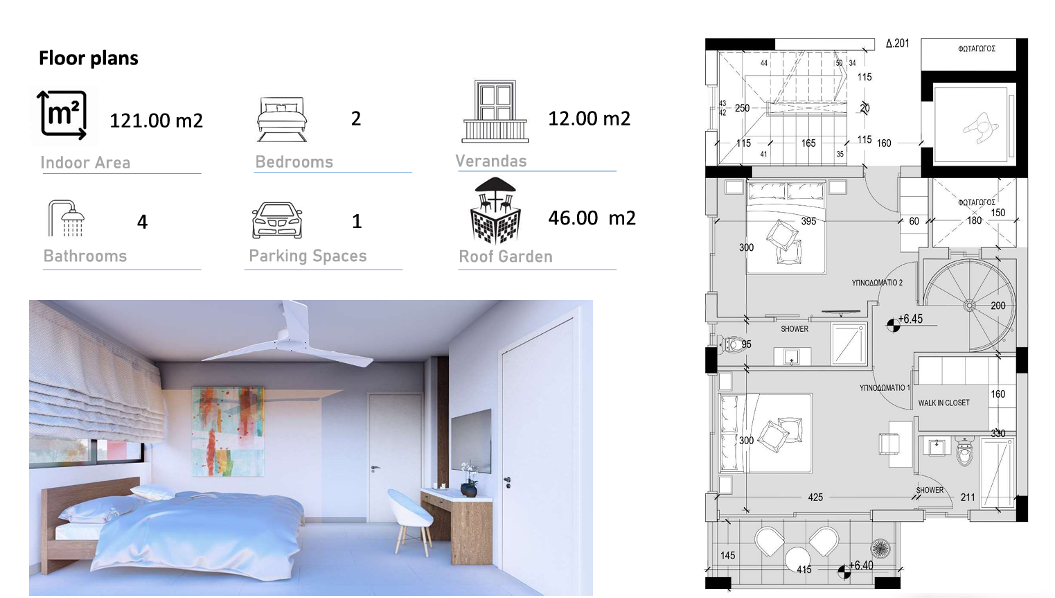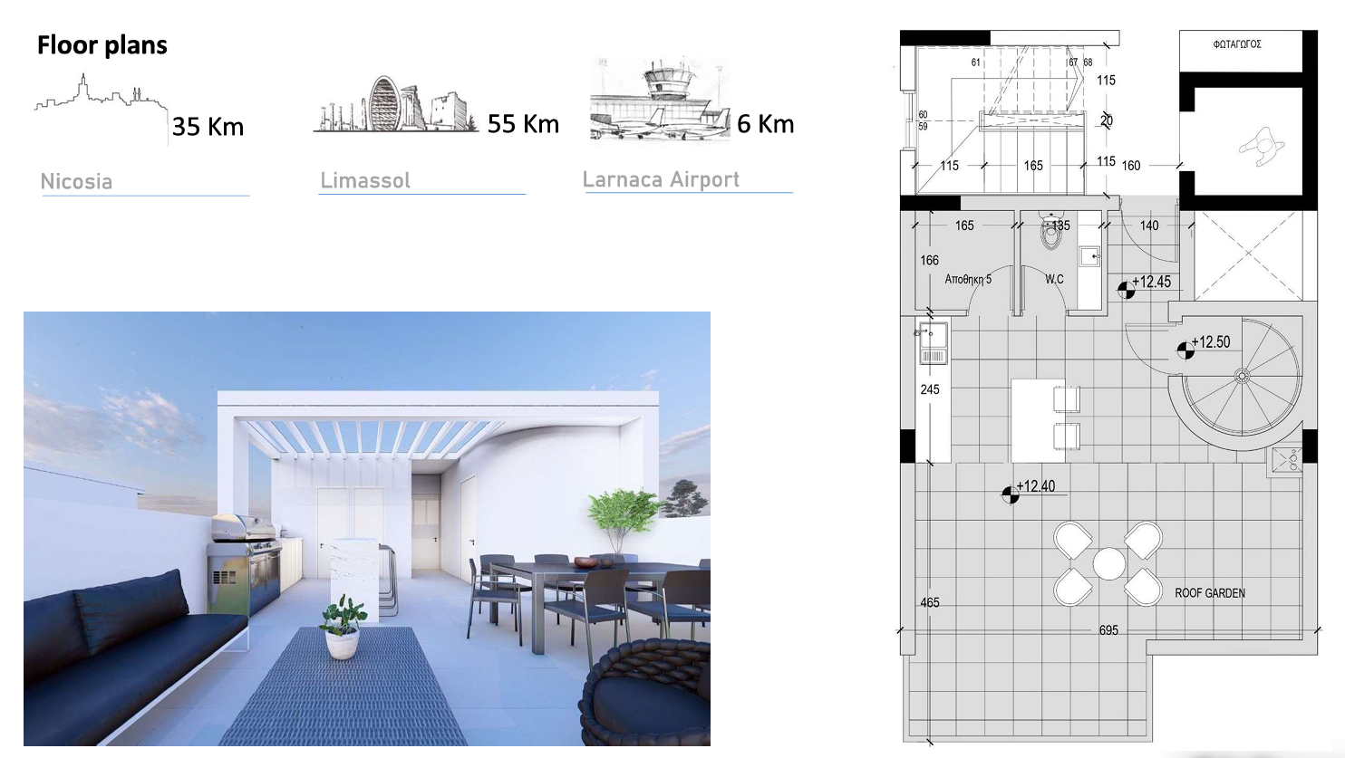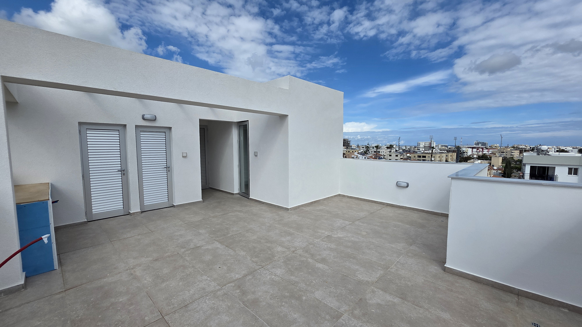 For sale a 3-level penthouse with 2 bedrooms and a roof garden in the Metropolis Mall area. The penthouse with an internal area of 121m2 is divided into three levels: on the 3rd floor there is a main entrance, where there is a spacious living room with an open-plan kitchen-dining room with access to a covered veranda, as well as a guest toilet, 2 bedrooms with their own shower rooms and a dressing room are located on a spiral staircase. There is a 45m2 rooftop garden with a barbecue area, a storage room and a guest toilet. The complex is located in a quiet area of Larnaca with mostly private houses, just 500 meters from the Metropolis Mall, at the same time with convenient access to the highway. There is a children's park and sports grounds in the immediate vicinity.