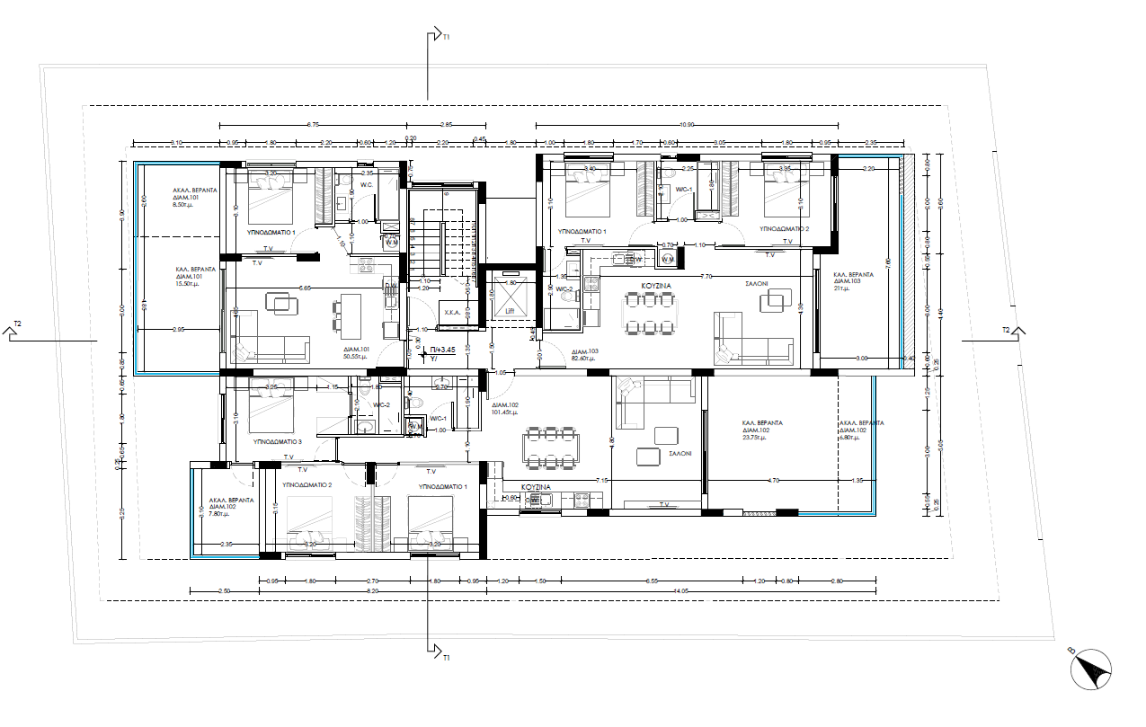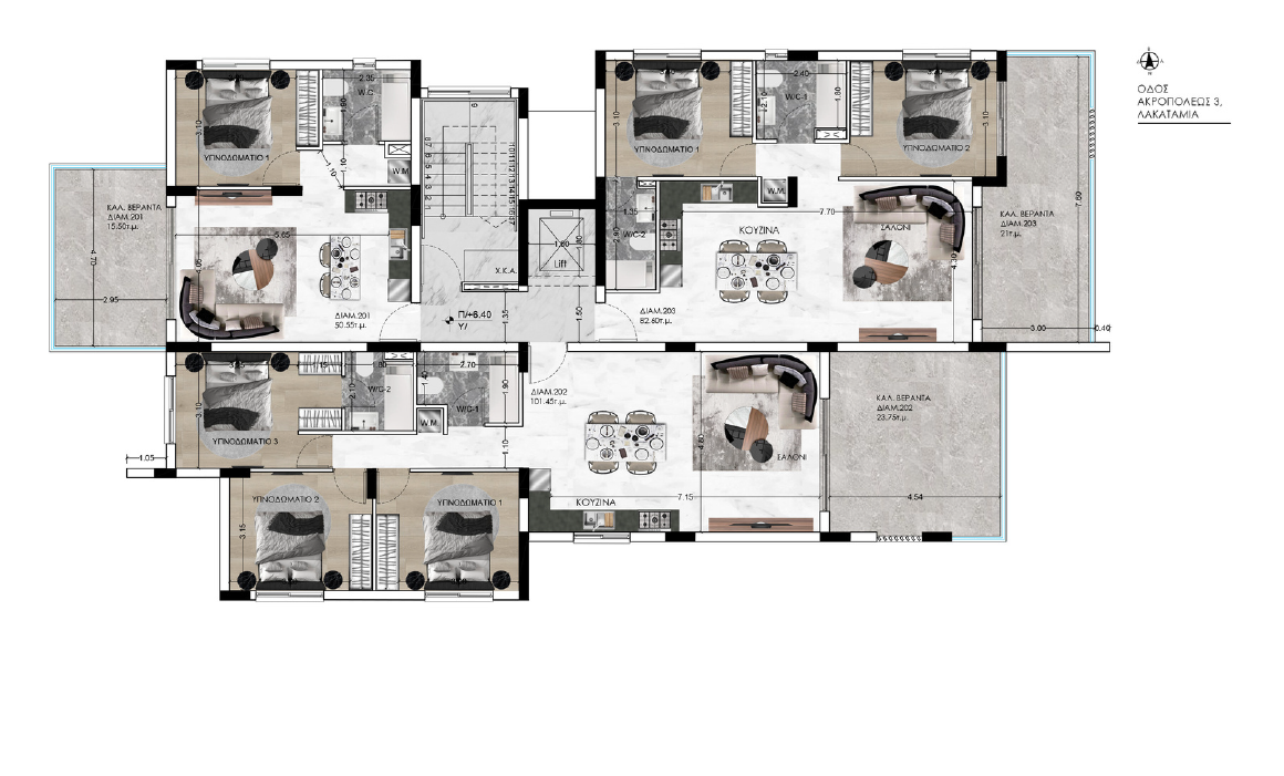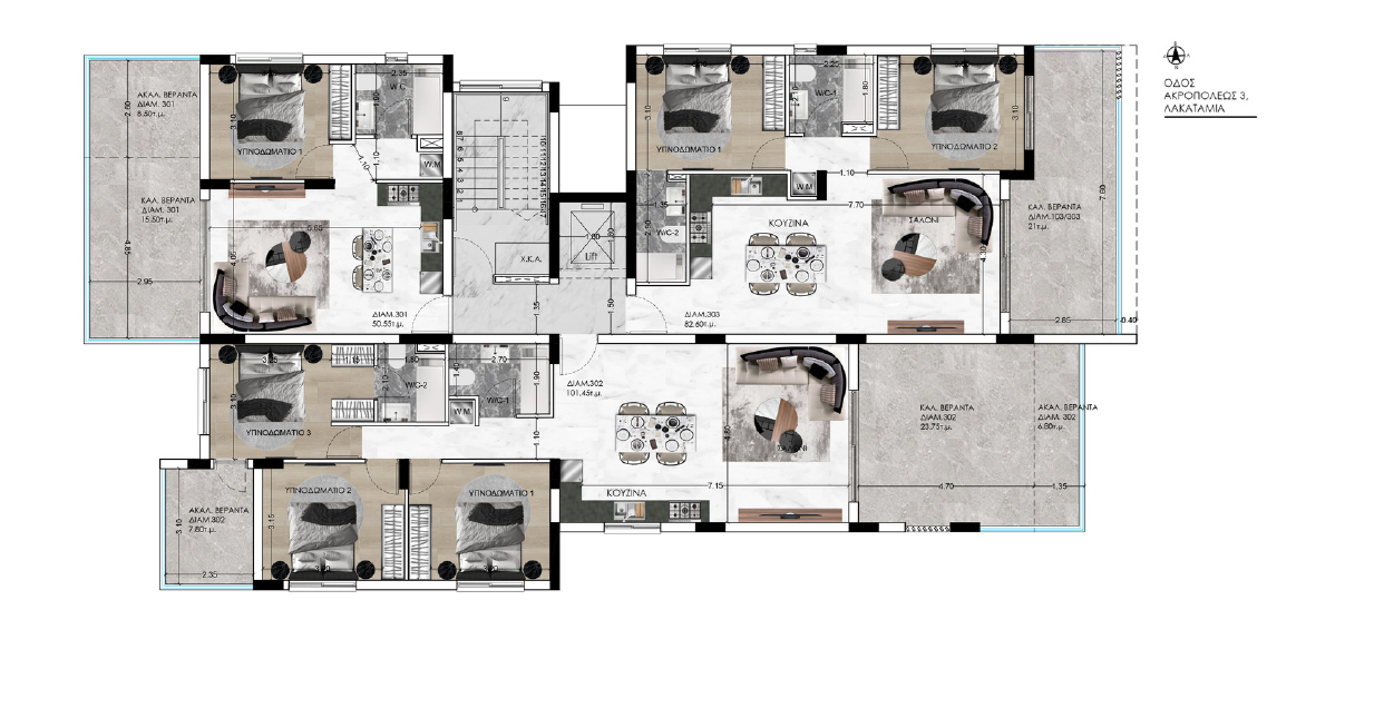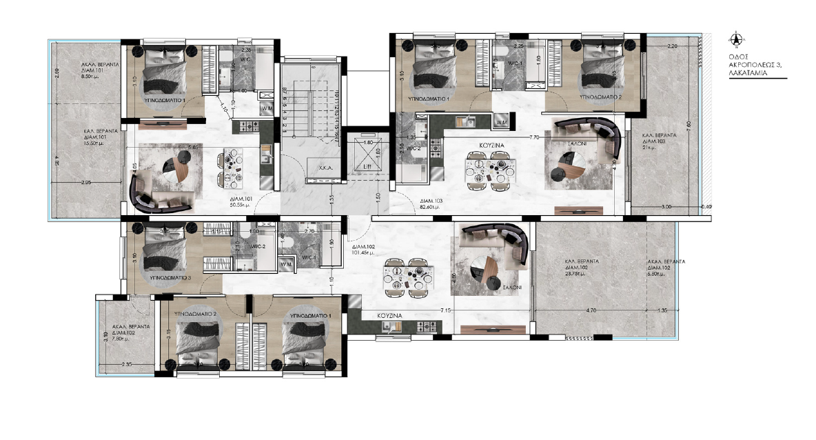 Apartment for sale in Lakatameia, Nicosia. It is a three-storey building with a total of 9 apartments: 3 one-bedroom apartments, 3 two-bedroom apartments and 3 three-bedroom apartments. Each apartment combines high-end design, finishes and the latest trends using high-quality thermal insulation materials, finishes and plumbing. The apartments have functional layouts and spacious verandas. Convenient storage rooms and parking spaces are provided for each apartment.