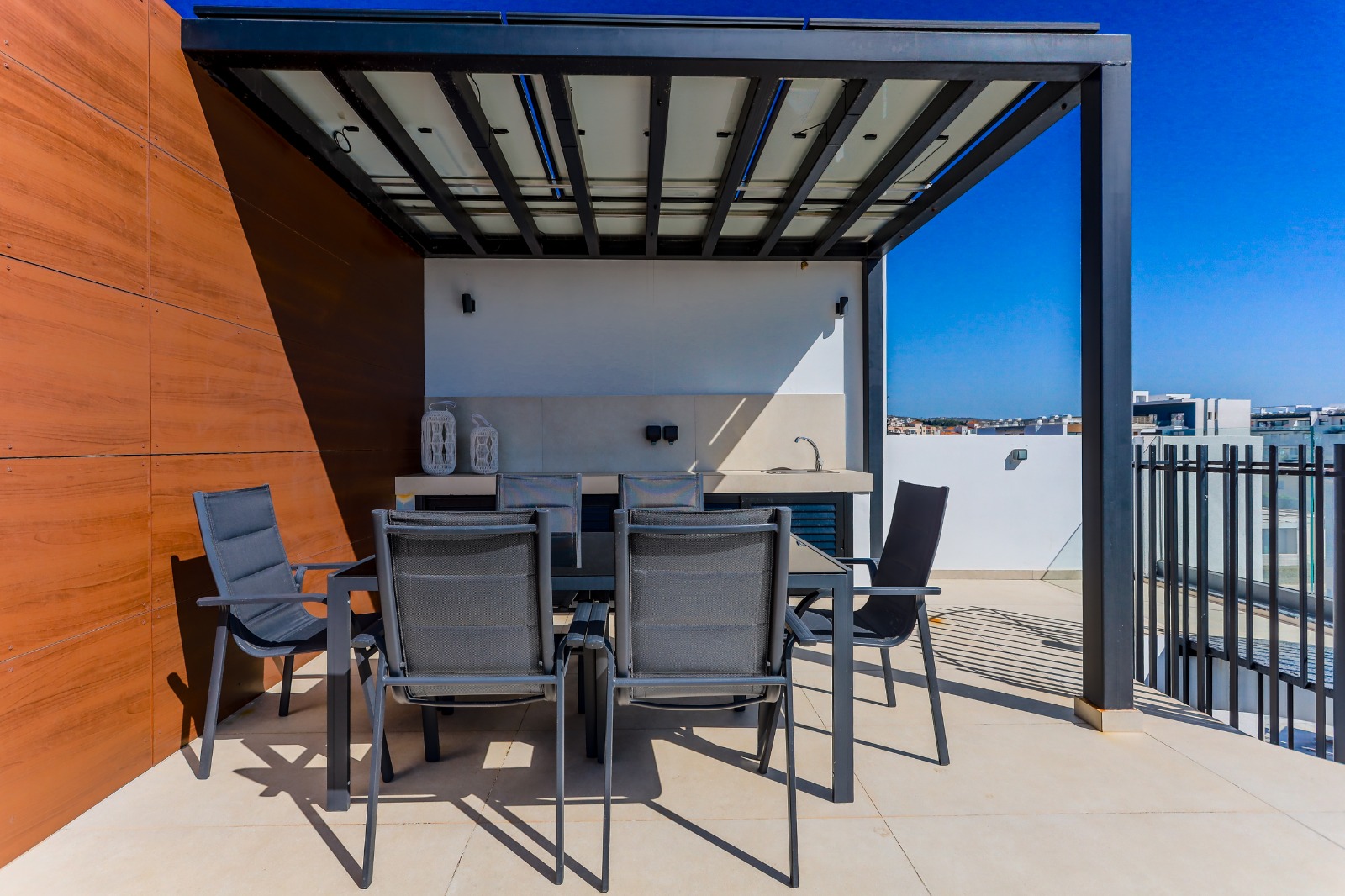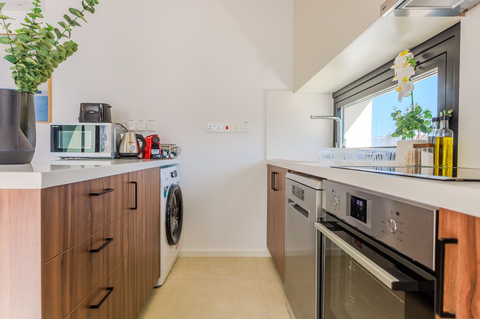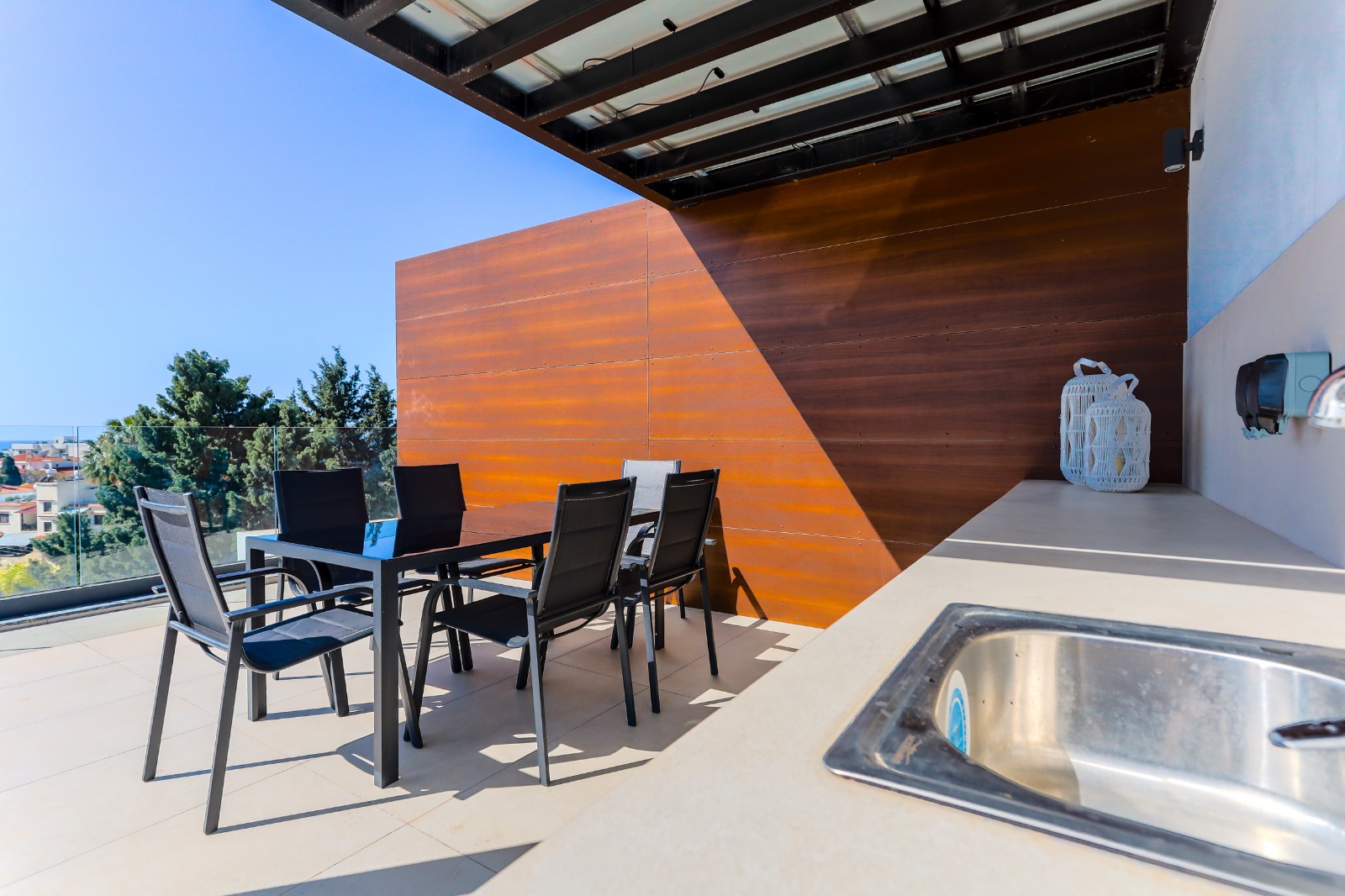 For sale a two-bedroom penthouse with an area of 150 m2 in the Town Center area, Paphos. The penthouse includes 2 bedrooms, a kitchen, a living room, 2 bathrooms, a spacious veranda of 27 m2, a roof garden of 37 m2, as well as a storage room and a parking space. The residence is sold furnished. The property is located in the central part of Paphos, providing convenient access to the urban infrastructure. The property is ready to move in and has a spacious layout, plenty of natural light and a high degree of privacy.