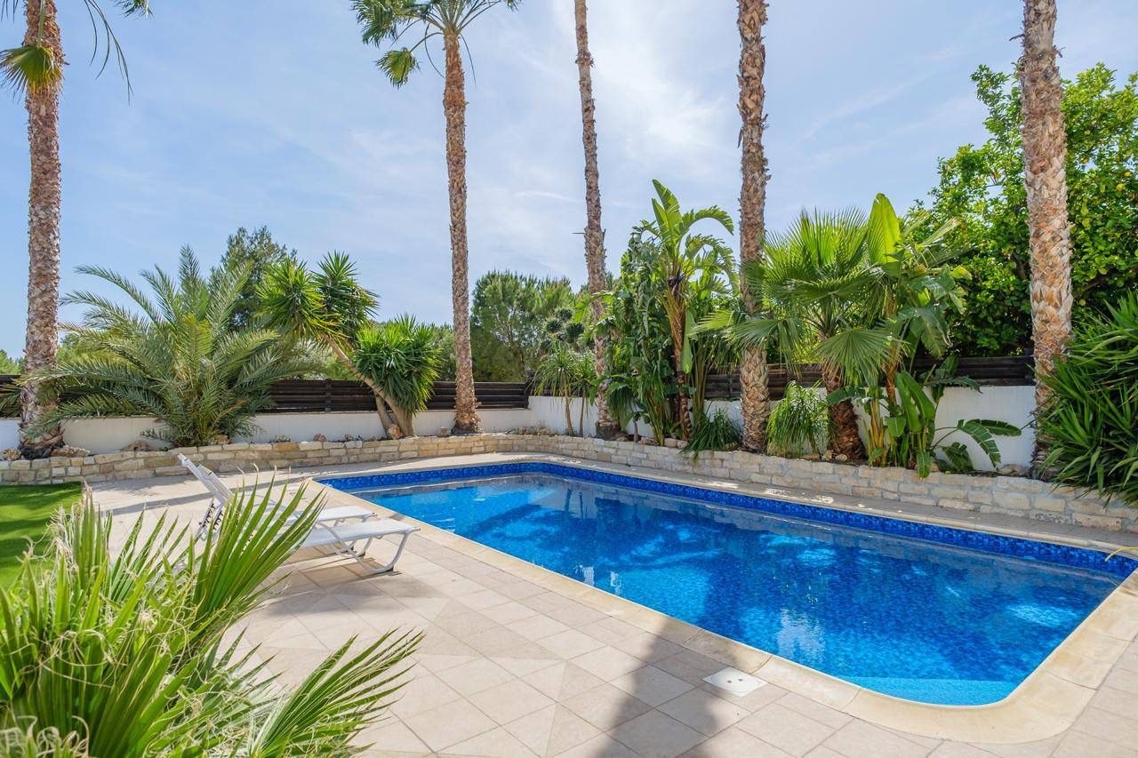 For sale a four-bedroom house with an area of 220 m2 on a plot of 570 m2 in the area of Ypsonas, Limassol. The house includes 4 bedrooms, 3 bathrooms, a kitchen, a living room, balconies and a storage room. The residence is equipped with an air conditioning system. The house was completely renovated in 2005. There is a private swimming pool, well-kept garden and covered parking on site.