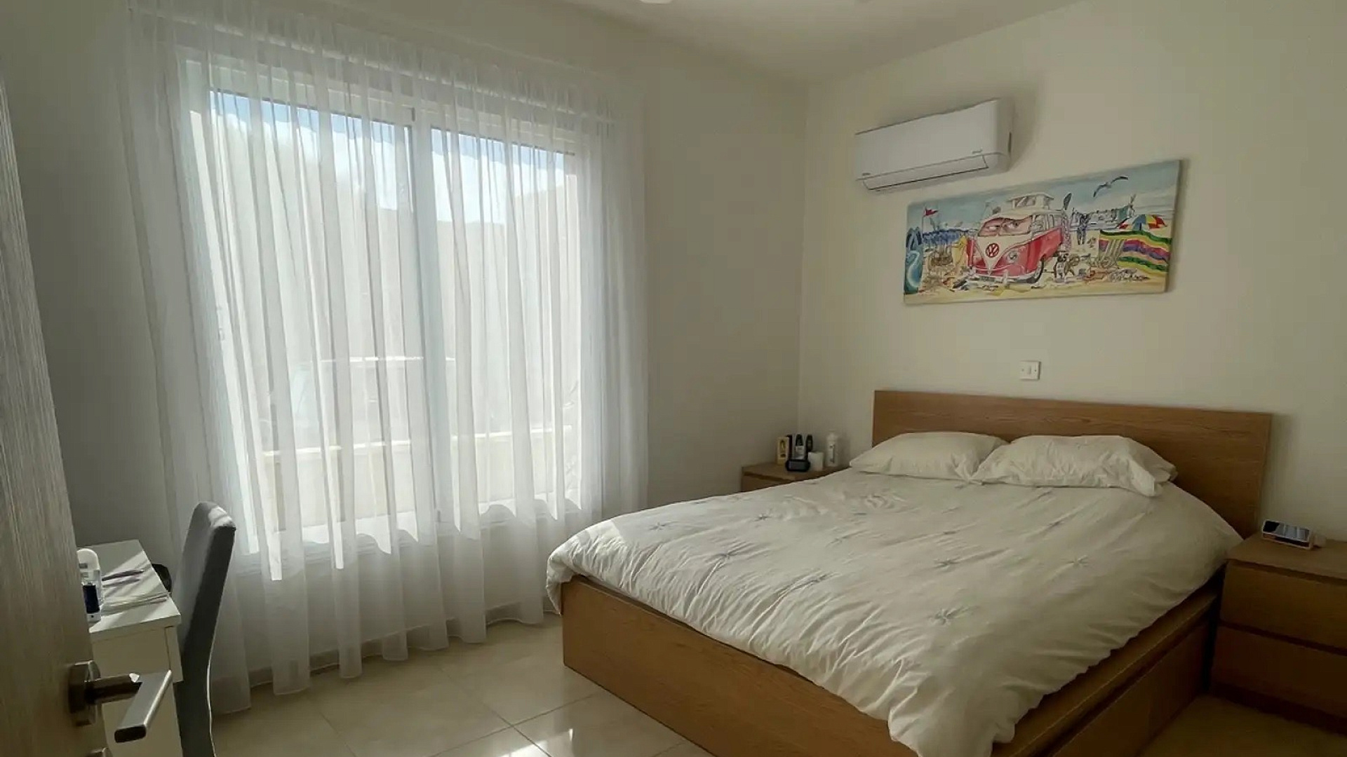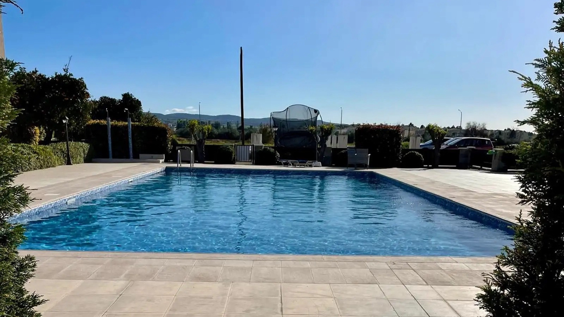 Two-bedroom apartment of 100 m2 for sale in Mandria Pafou, Paphos. The apartment includes 2 bedrooms, 2 bathrooms, an open-plan kitchen combined with a living and dining area, and direct access to a private garden. The apartment is unfurnished, equipped with air conditioning and heating in all rooms. The residence is located on the ground floor and offers convenient access without stairs, has a private garden, outdoor parking, closed guarded territory, low utility costs, a full set of Title Deeds and high investment potential. The property is located in a well—maintained residential complex with a communal swimming pool, within walking distance of a bus stop, beach, beach bar and village square with traditional taverns, cafes and shops, while a large supermarket is a 5-minute drive away, and Paphos International Airport is 10 minutes away.