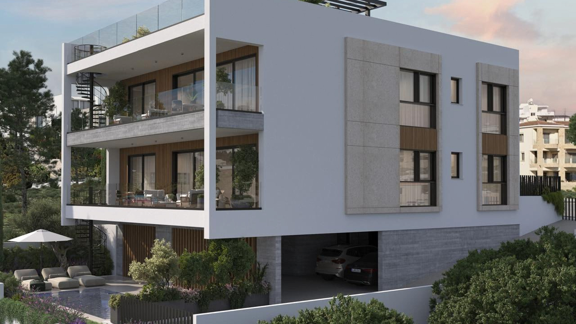 The facility offers a high level of comfort and includes a private swimming pool, an outdoor sauna, a landscaped garden, as well as a kitchen and bathrooms with high-quality modern finishes. The location provides convenient access to Paphos International Airport, as well as proximity to Coral Bay Beach, archaeological sites, restaurants and shops.