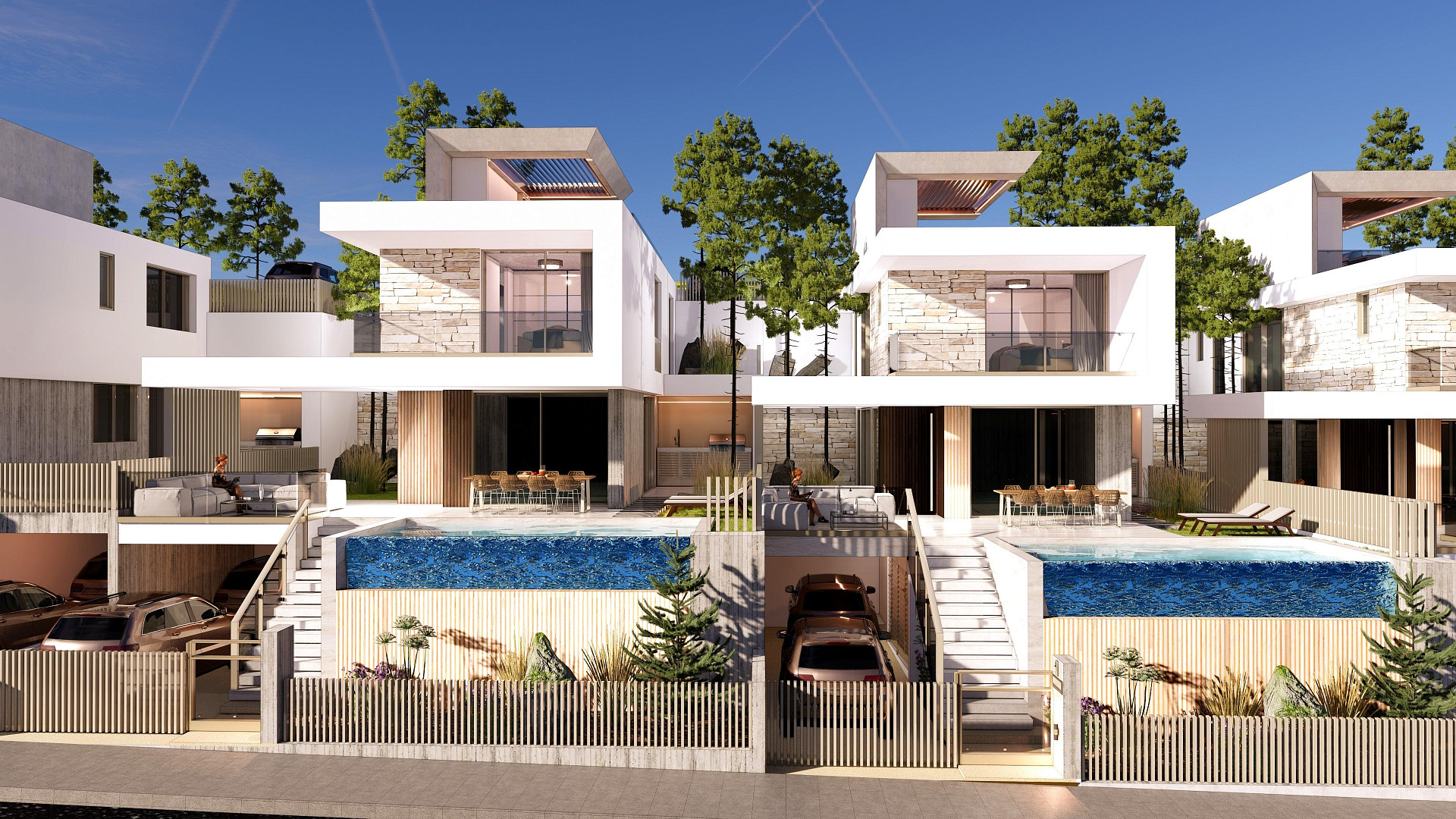 Modern villa for sale in Fasoula, Limassol. Each villa is designed in a modern architectural style and has a thoughtful layout that creates a spacious and functional living space. The construction uses high-quality materials and modern finishing solutions, including granite-style ceramic tiles in all rooms. The villa is equipped with a private pool, a spacious roof terrace and a barbecue area, which are already included in the price and are ideal for relaxing and entertaining guests. For maximum comfort, preparation for underfloor heating, installation of a photovoltaic system and air conditioning are provided.