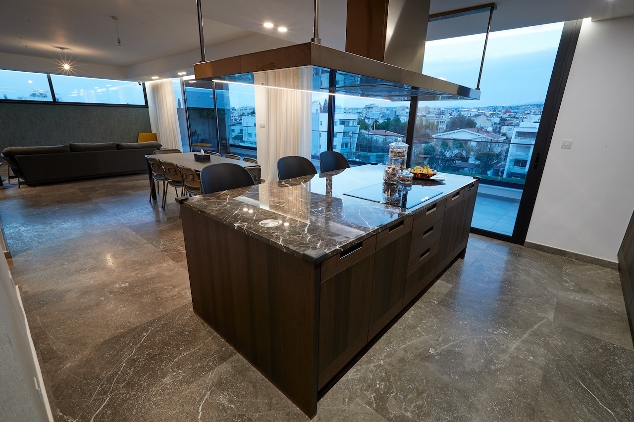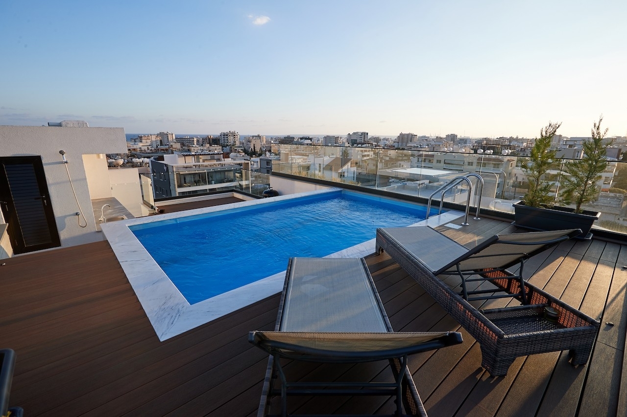For sale a penthouse on the whole floor with a private roof garden and a swimming pool in the very center of Limassol. Luxury finishes, Italian cuisine, high-quality and modern appliances.