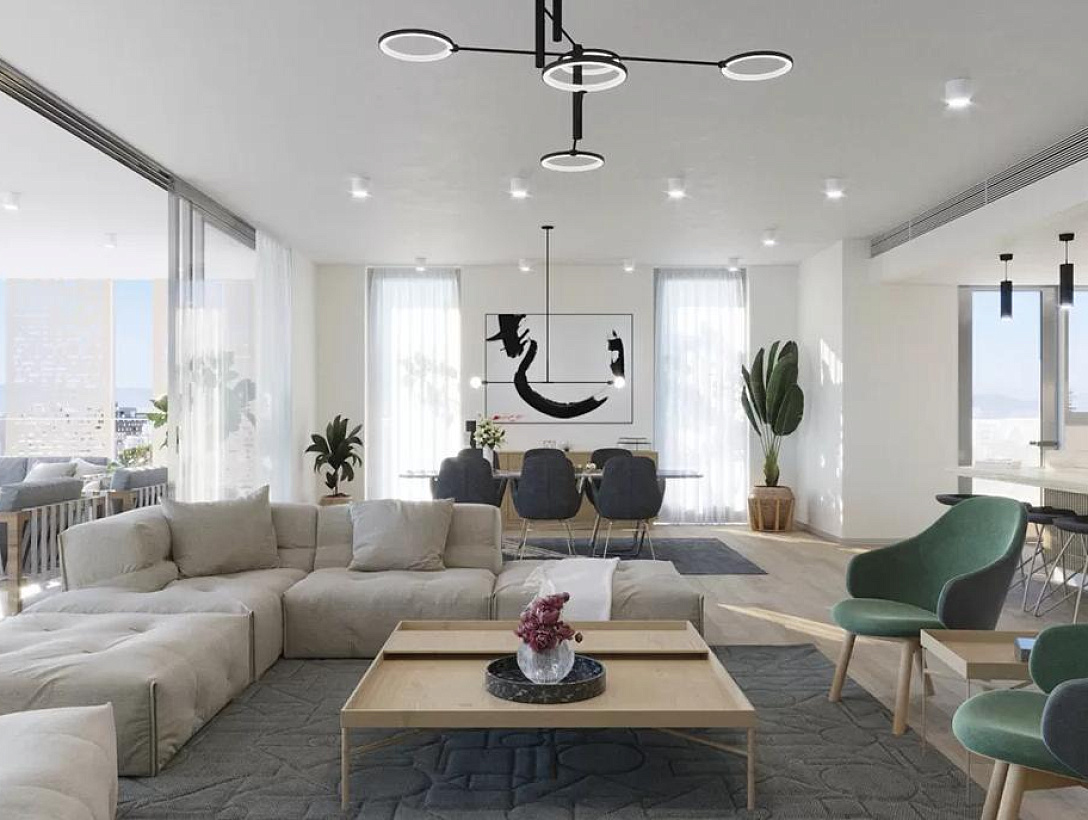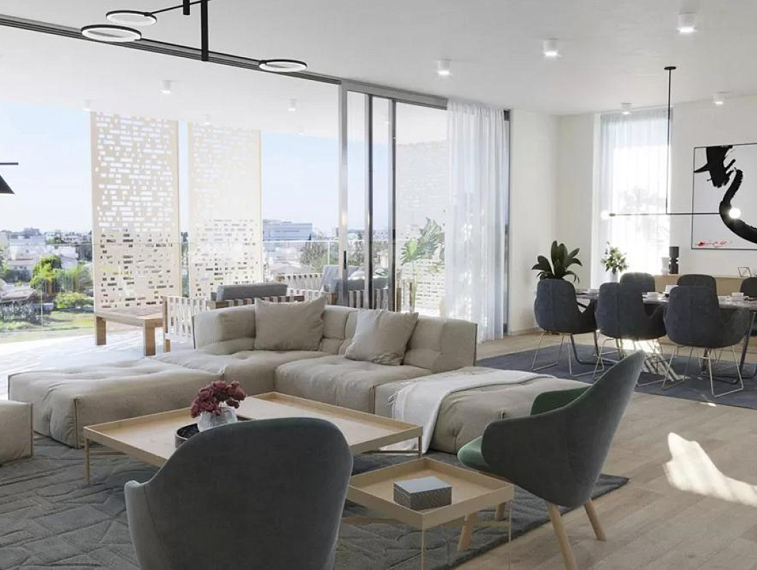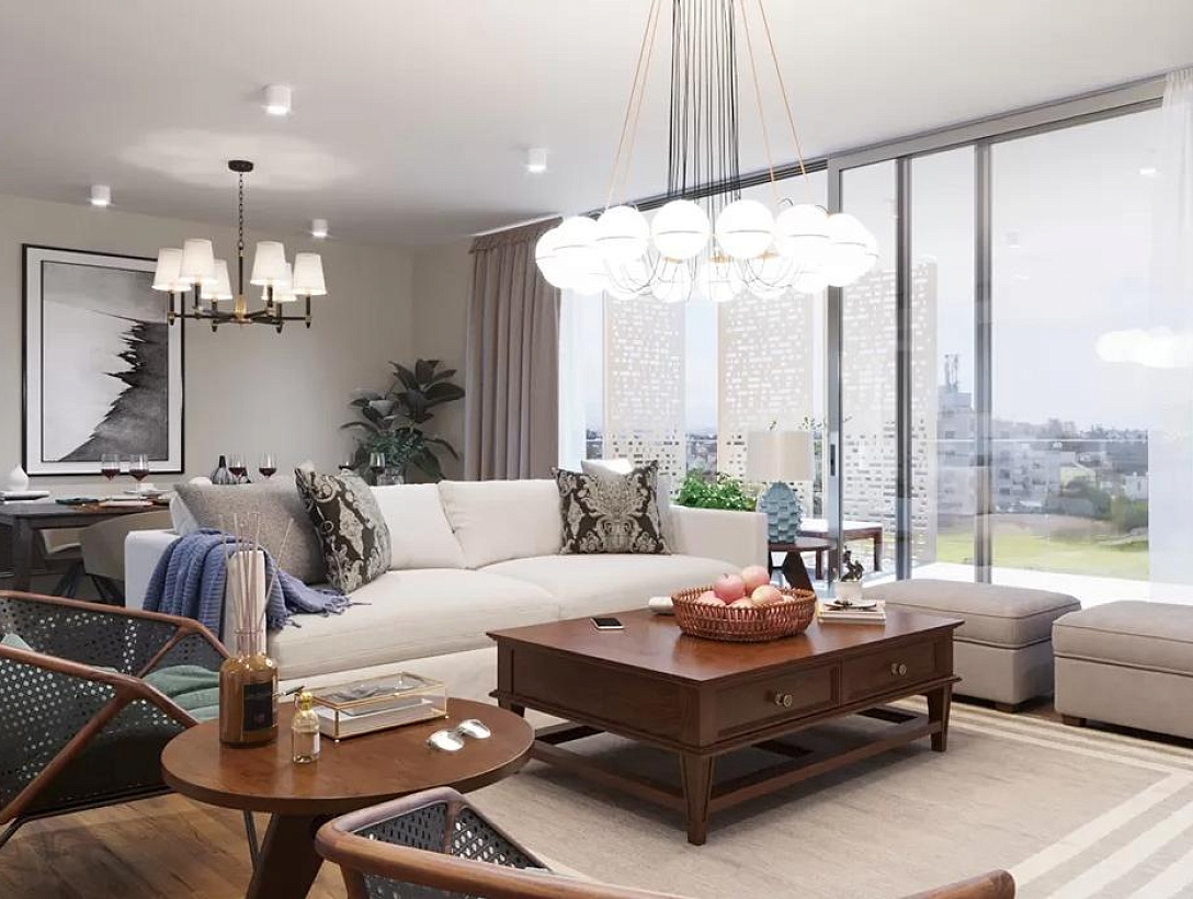 Apartment is for sale in a new ready-made complex in the most exclusive residential area of Engomi, Nicosia. The building is distinguished by high-quality materials and is located next to a pedestrian road and a green area.