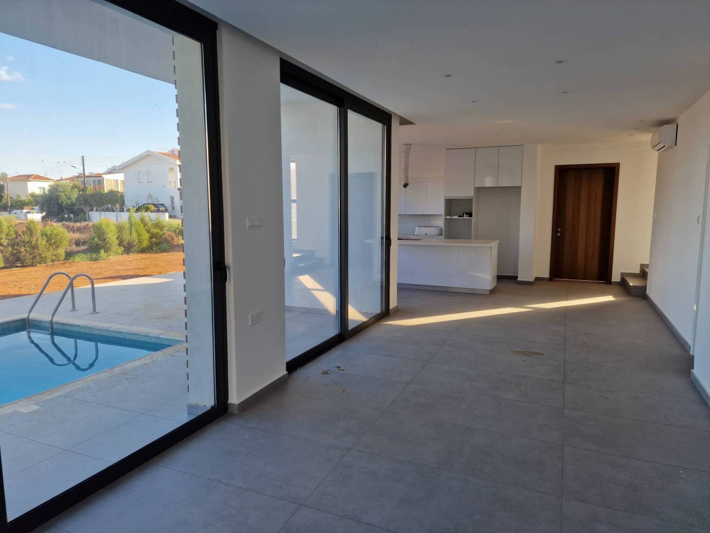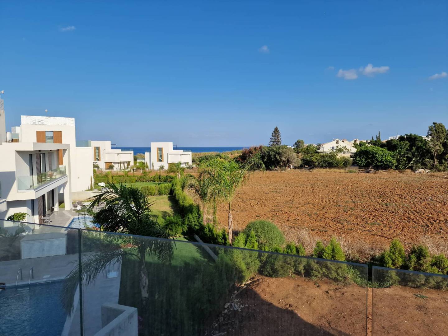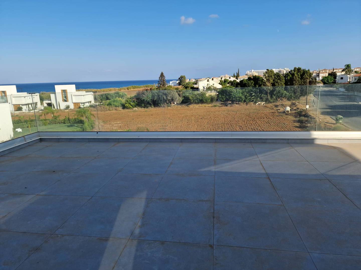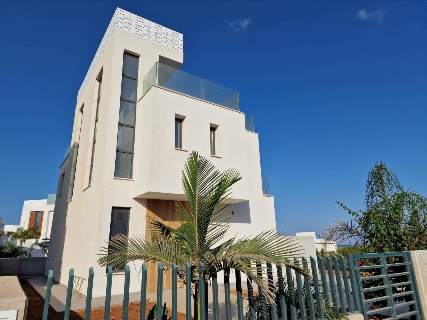 Villa for sale in a new complex, near the beach of Agia Triada, with a private pool, three bathrooms, panoramic sea views from the roof garden, the whole complex is commissioned, roads and communications are ready, six hundred meters from the bakery Zorpas, pipes are laid for the heating system.
