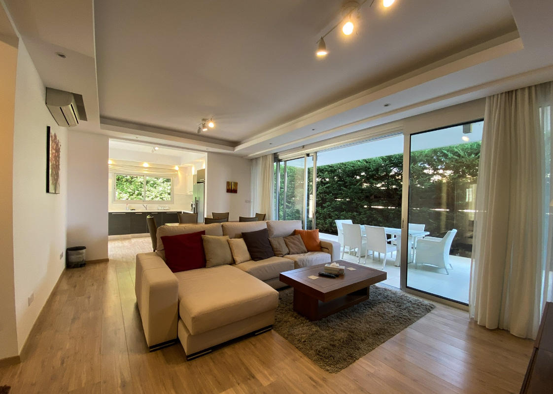 For sale a cozy 3-bedroom apartment located on the ground floor with its own garden of 220 m2, in the Germasogeia area, 15 minutes walk to Dasudi beach with its famous eucalyptus trees. The building was built in 2014. The covered area of the apartment is 113 m2 + 25 m2 covered veranda + 220 m2 garden with Jacuzzi. The apartment is fully furnished and equipped with household appliances. Storage room of 13 m2. Parking space.
