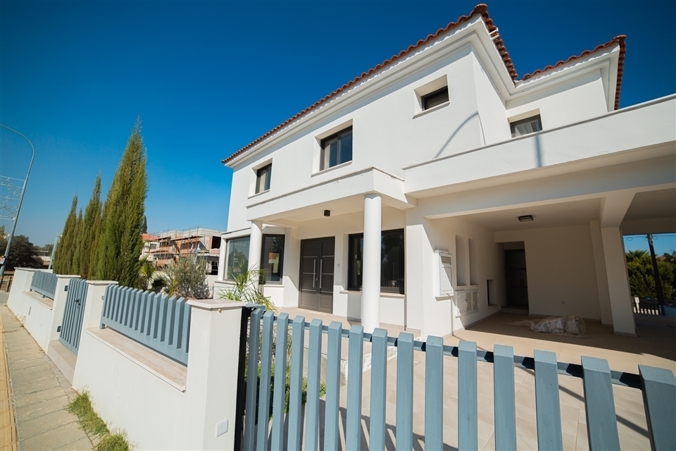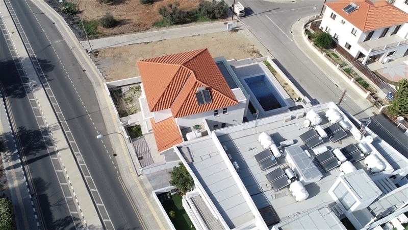 For sale a spacious four-bedroom villa in a quiet area of Latsia, Nicosia. The two-storey building stands separately on a corner plot and has a large outdoor area, with enough space for a future barbecue and a private pool.