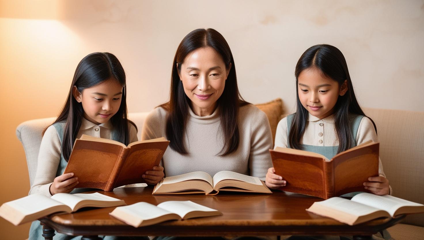 I got a picture of two girls and a mom reading books. Thank the Olympic gods it wasn't some camping trip or boating on a lake! It seems simple. But, it's important to not just say "girls reading" here, but to add a bit of life. Who is sitting where? What are their faces like? Maybe they're reading fairy tales. Or maybe mom is a strict teacher and won't let them leave until they learn all the chapters?