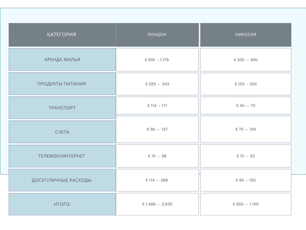 As the table below shows, the cost of living in London is almost twice that in Nicosia. In Cyprus's capital, students can get by on €1,000 per month, whereas in London, you will need around €2,000.