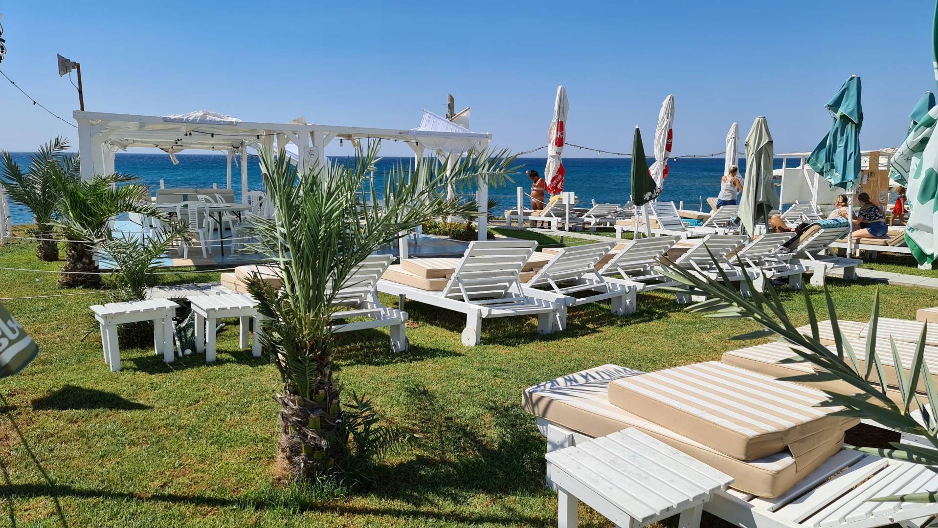The beach begins at the end of the Molos promenade and stretches almost 2 km east to the Crowne Plaza Hotel. Formally, it is divided into 2 parts (Alpha and Vita), between which there is a 500-meter gap opposite the Enaerios parking lot.