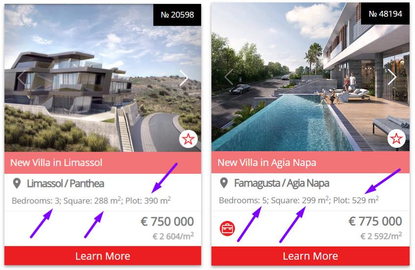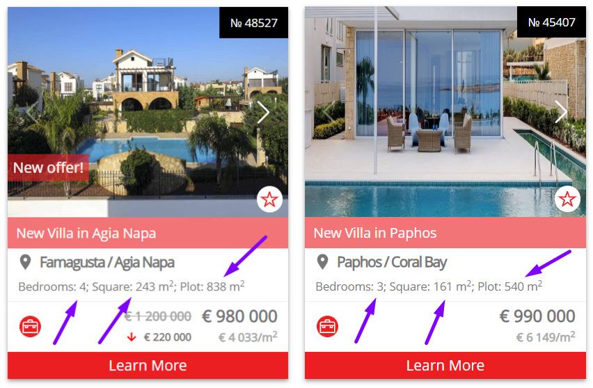 A couple of examples can be given to illustrate. Luxury villas in Ayia Napa and Limassol, in the second - luxury villas in Ayia Napa and Paphos. Obviously, with approximately the same class level in Napa, you can buy a house with a larger area (both housing and a house adjoining plot).