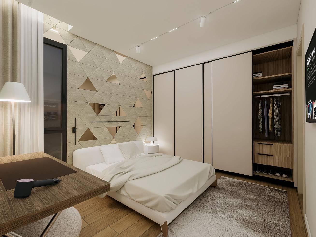 The two bedrooms are slightly smaller but still spacious. Each has space for built-in closets and a work and leisure area. One of them can easily be used as a nursery or office. The master bedroom has an impressive size and its own bathroom. Such a spacious apartment is suitable for large families.