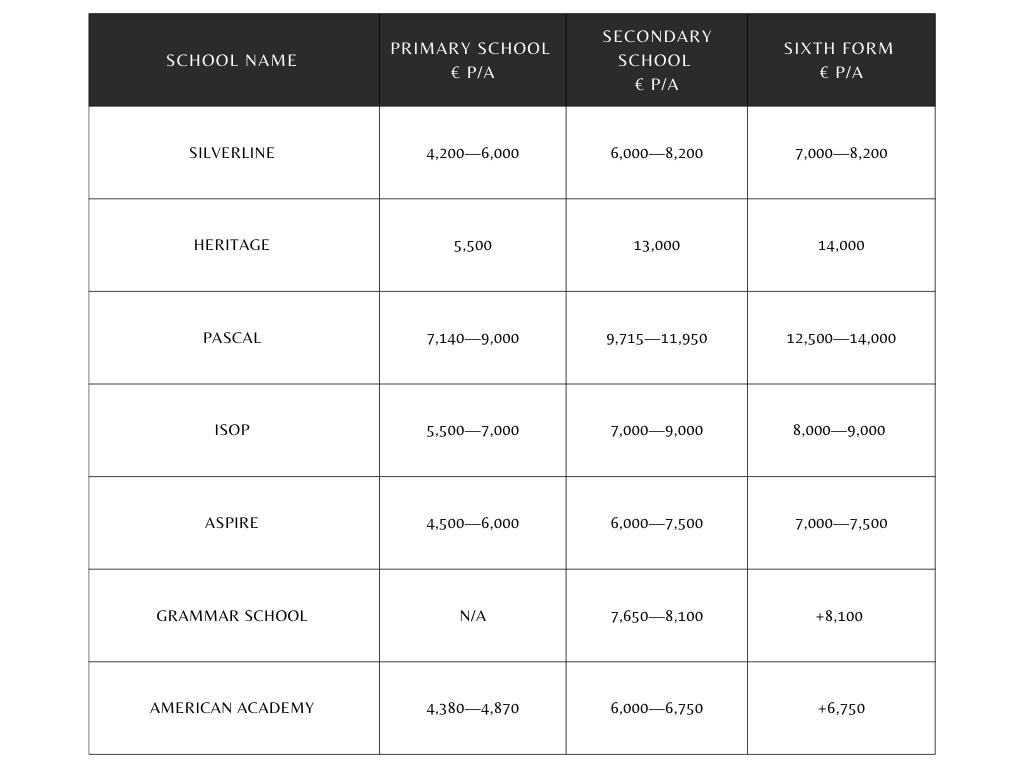 The private school tuition typically starts from 7,500 to 12,500 euro p/a. Additional costs, including exams, registration fees and extracurriculars might add up to 1,500—5,000 euro p/a, depending on the level of institution. So, the total costs can range from 9,350 to 16,350 p/a on average.
