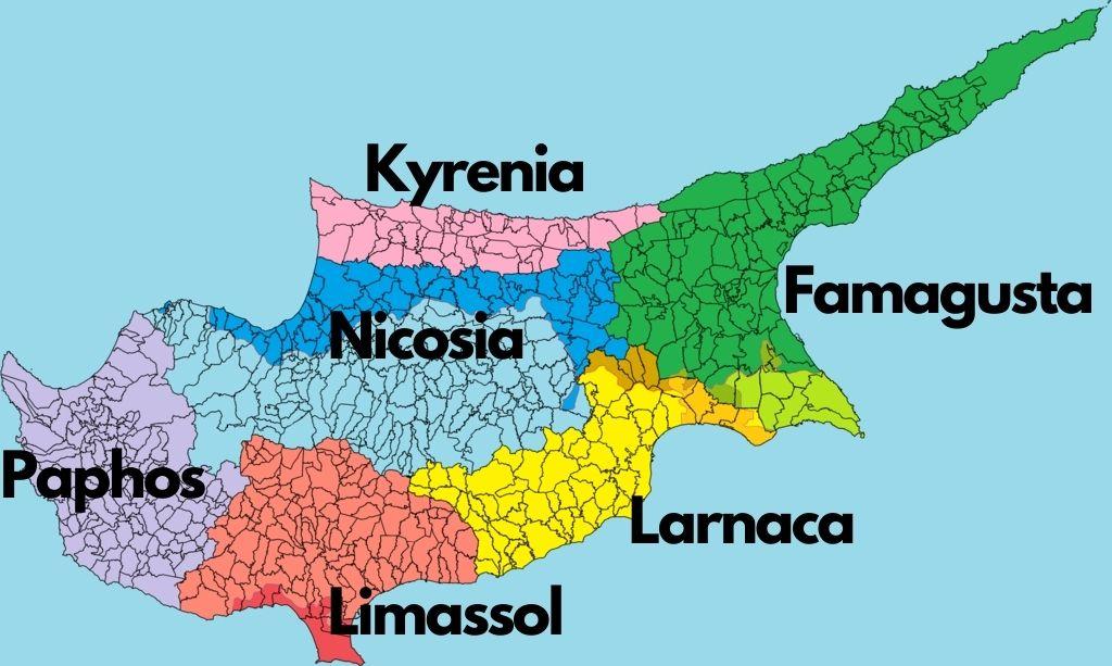 Since the time of British rule, Cyprus has been divided into six districts: Larnaca, Paphos, Nicosia, Limassol, Famagusta and Kyrenia.