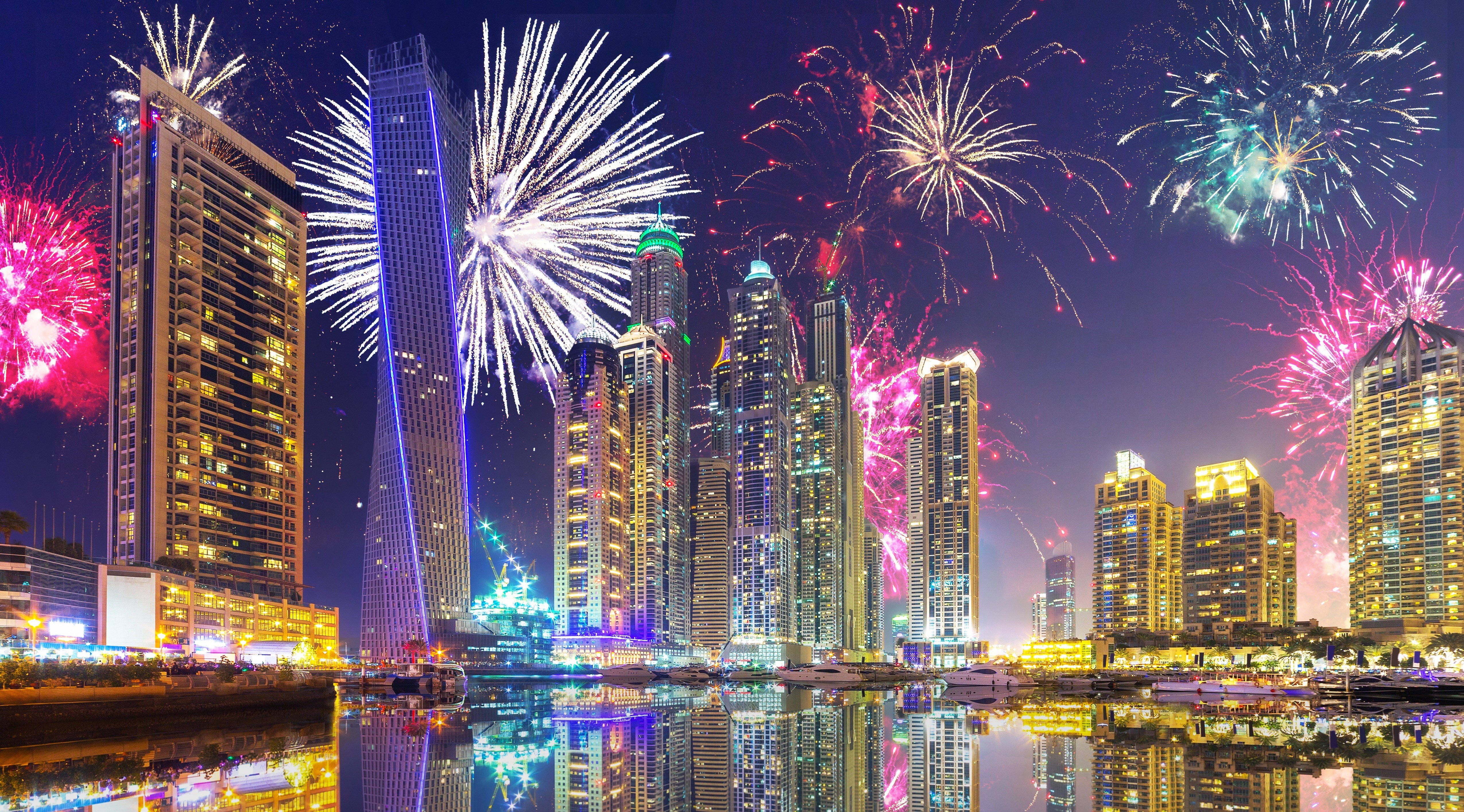 Regardless of nationality or religious beliefs, everyone in the UAE enjoys celebrating the New Year from 31 December to 1 January. Most celebrations are accompanied by parties, parades and fireworks. Downtown Dubai is at the heart of the New Year celebrations, with stunning laser shows projected onto the base of the world's tallest tower, the Burj Khalifa. There will also be colourful pyrotechnic shows on Palm Jumeirah Island. In Abu Dhabi, the celebrations are more modest, with only fireworks on the Corniche and Yas Island promenade.