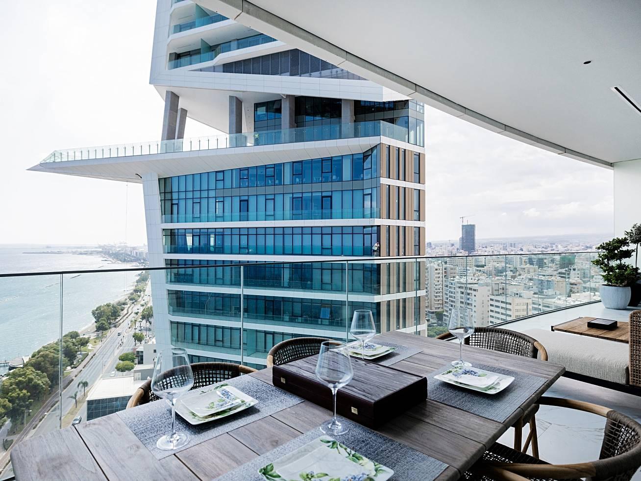 A spacious 153m2 apartment on the 27th floor of the tallest building in Nicosia. The windows of these luxurious apartments offer stunning panoramic views of the capital of Cyprus. The apartment has a practical and well thought out layout. All rooms are finished with high quality and expensive materials. The apartments are distinguished by their exceptional sophistication, comfort and unique design.