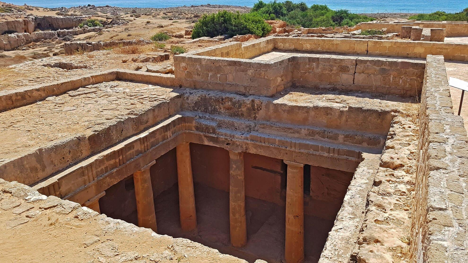 The Tombs of the Kings in Paphos are located in the city center, not far from the Archaeological Park and harbor. This is not just tombs but an entire necropolis covering an area of 1.2 km2. This burial complex is an exact copy of luxurious residences of that time and consists of numerous rooms (burial chambers), inner courtyards (atria and peristyles) with Doric columns, staircases, and vestibules.