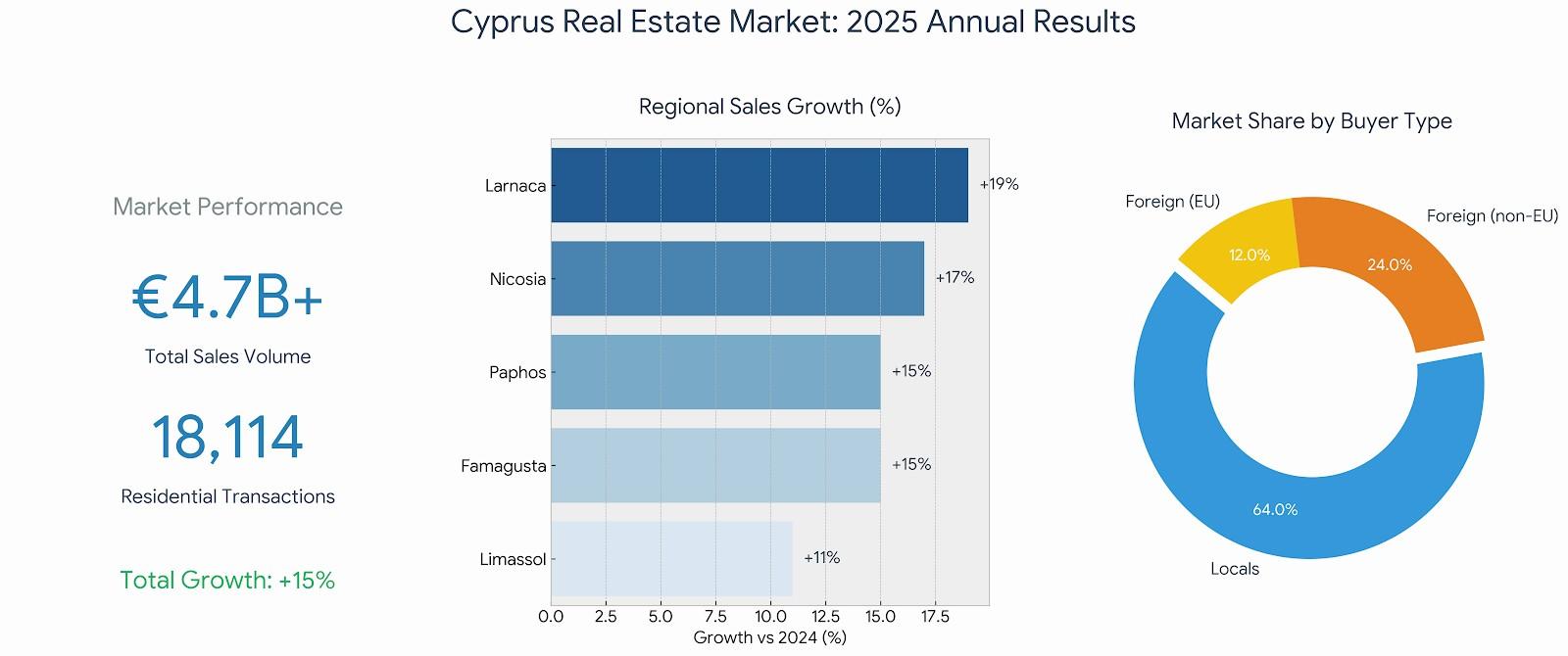The year 2025 in Cyprus was marked by major changes and unexpectedly strong final figures and indicators for many observers. While experts were actively debating whether the real estate sector would remain stable at all, the data from the Land Department dispelled all doubts of the skeptics. The total value of properties sold in Cyprus exceeded the 4.7 billion euro mark.