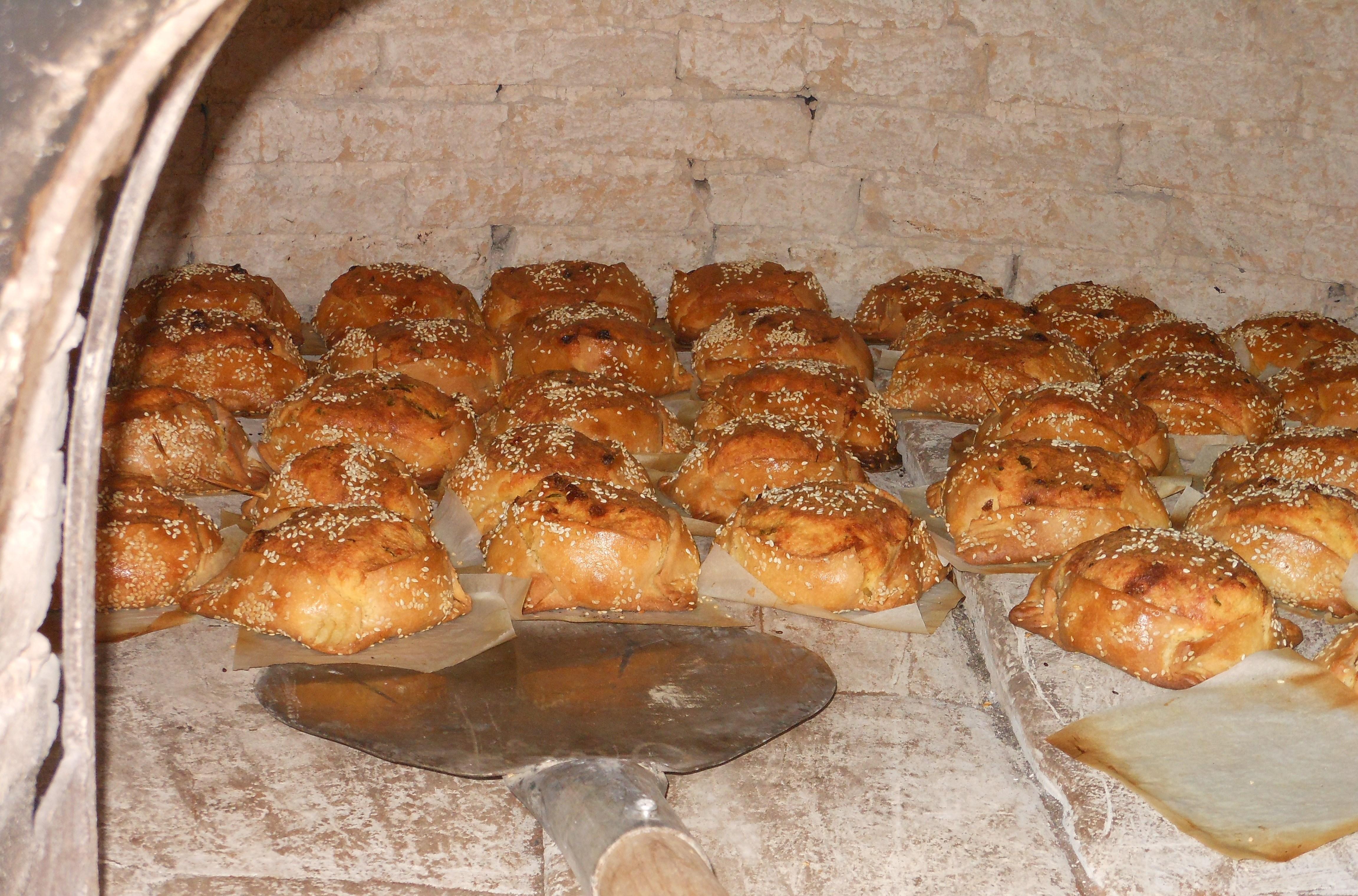 Be sure to visit local bakeries—called fournos (φούρνος). These are the best places to buy freshly baked koulouri bread, and during the Easter season, aromatic flaounes straight from the oven. Bakeries also often sell tahinopitta (ταχινόπιτα)—a sweet pie made with tahini paste and carob syrup, especially popular during fasting periods—and kolokoti (κολοκοτή), pumpkin and bulgur-filled pastries.