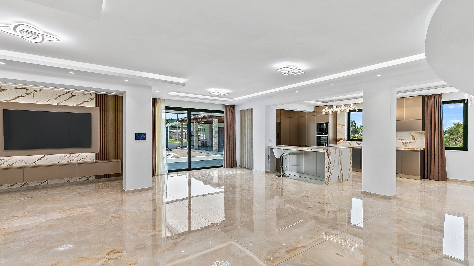In the hills of Kouklia, not far from Paphos, there is a villa that perfectly embodies this philosophy. This is one of those rare cases where privacy does not mean isolation. The villa's location is as practical as it is idyllic, just a couple of kilometres from the sea and close to the prestigious LUMIO international school with its Cambridge programme. It is also within easy reach of shops and the Alphamega hypermarket. At the same time, it offers instant access to two elite golf resorts, Aphrodite Hills and Secret Valley, as well as the motorway and Paphos International Airport.