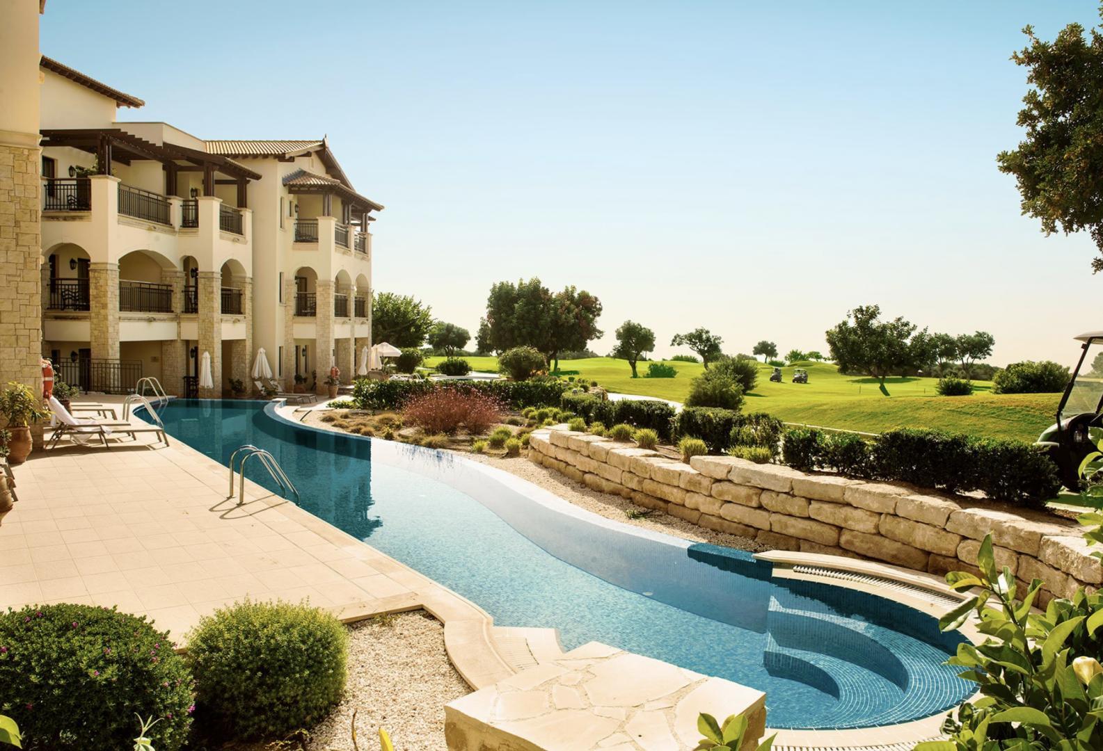 Residents benefit from the service of a 5-star hotel located on site, an upscale year-round spa, a variety of quality restaurants and chain coffee shops. Despite the grandeur of the project, in this area a new one-bedroom apartment (total area of 83 m2) can be purchased for 200 thousand euros. This is a hallmark of Paphos - the city teaches to live beautifully and without fuss. By the way, you don't have to know how to play golf. But if the desire wakes up, there are golf course hills and a school nearby.