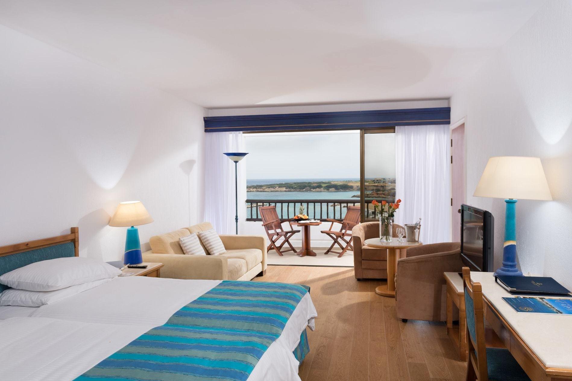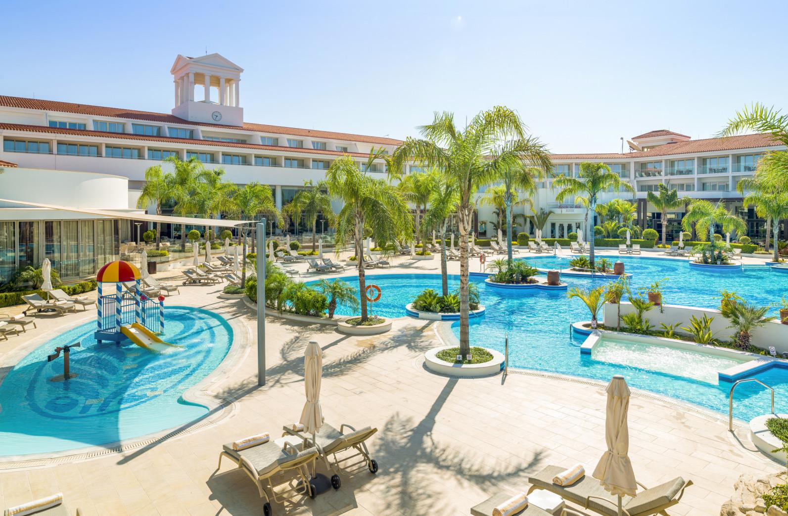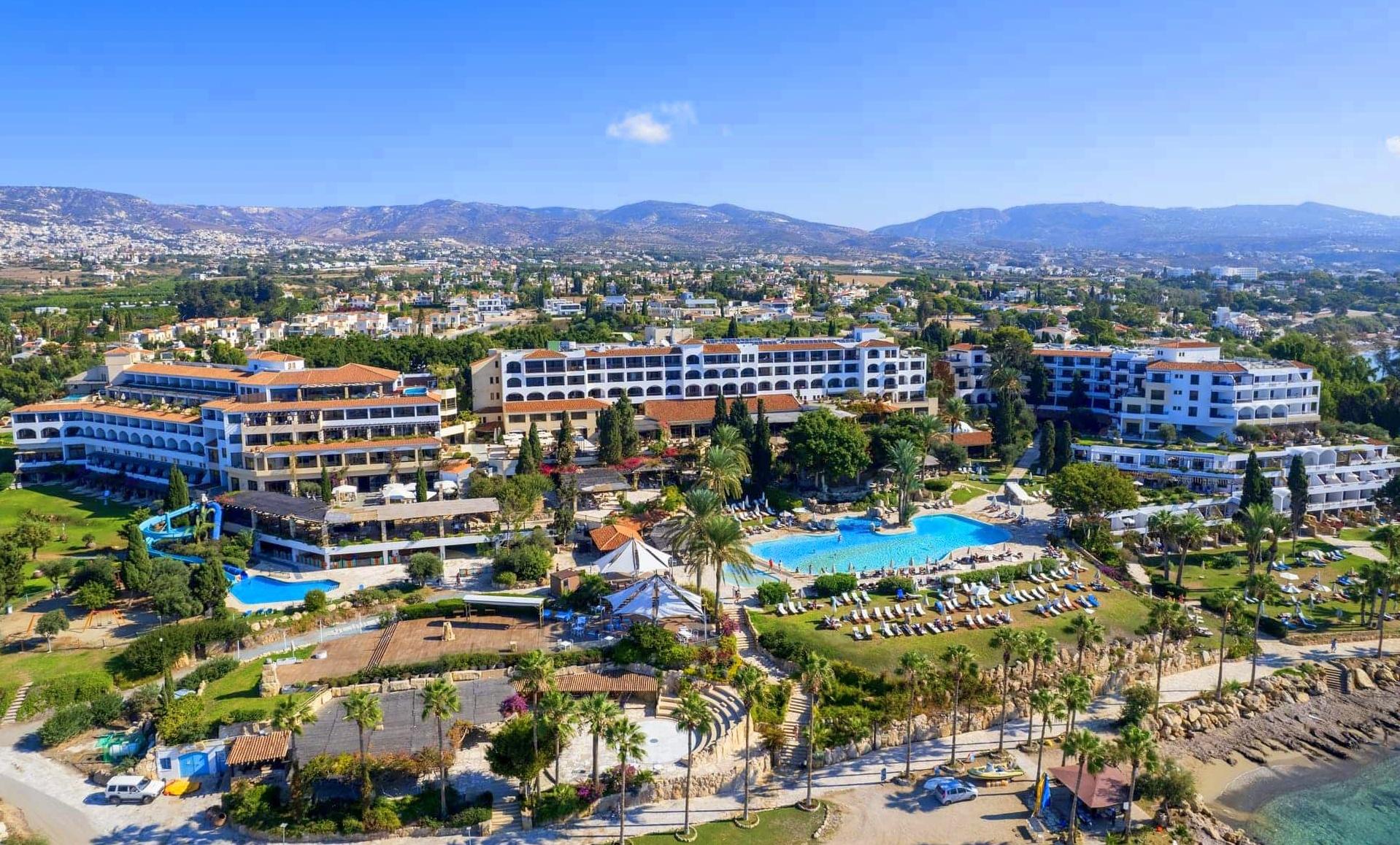 The hotel is located within a natural park, just a few steps from the shoreline. Its favorable location allows guests to get closer to the history, mythology, and architecture of the ancient city. Paphos Airport is 15 km away. The three-story hotel buildings form a crescent shape, and the "resort within a resort" concept features the separate Village Deluxe wing with rooms and private pools exclusively for adults.