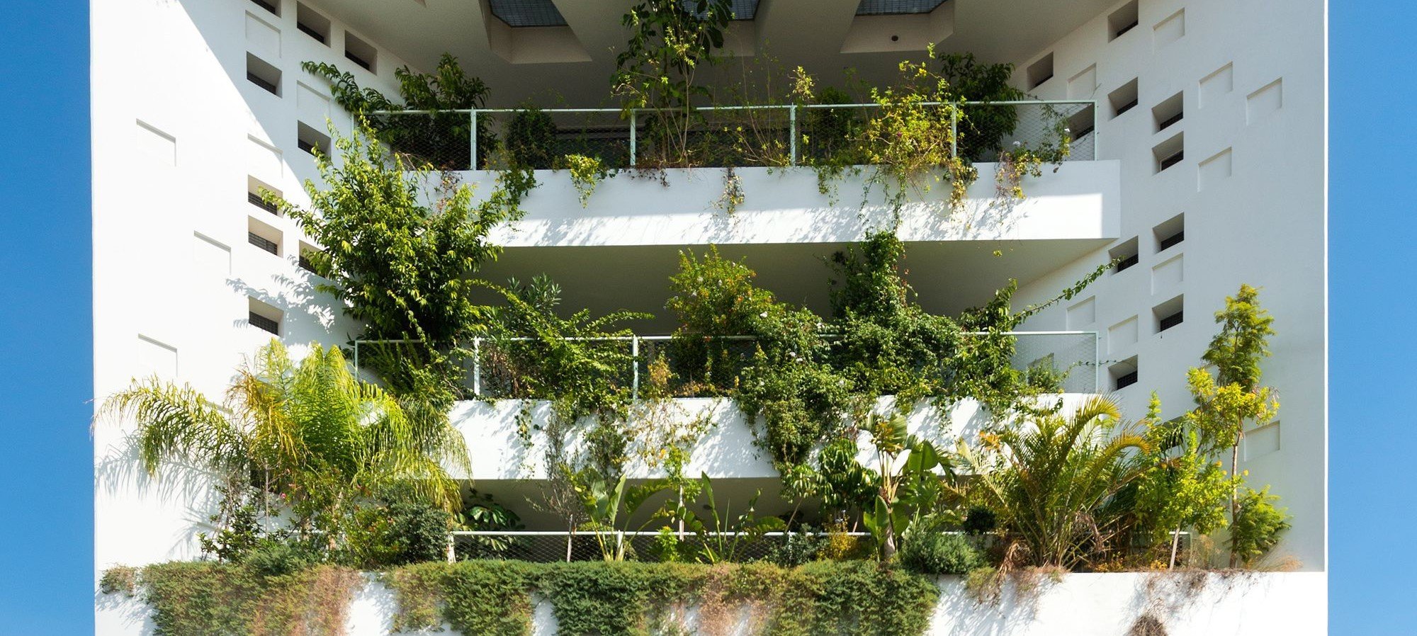 At first glance, the simple white concrete structure with pixelated openings across its façade appears minimalistic, but in reality, it is a living installation that transforms over time. The "living façade" is made up of endemic Cypriot flora, mainly climbing plants that gradually grow through the pixelated openings. Their color and texture change with the seasons, giving the building a dynamic, evolving appearance. On the southern façade, the vertical garden occupies about 80% of the surface, providing natural sun protection by shielding the apartments and offices from direct sunlight in the summer while allowing maximum light penetration in the winter. On the northern façade, the balconies extend outward, offering views of the park and city, whereas on the eastern and western sides, they are set behind the pixelated concrete façade for protection against noise, wind, and sun exposure.