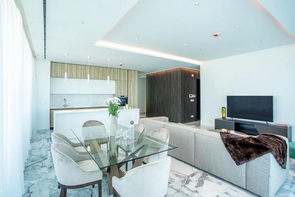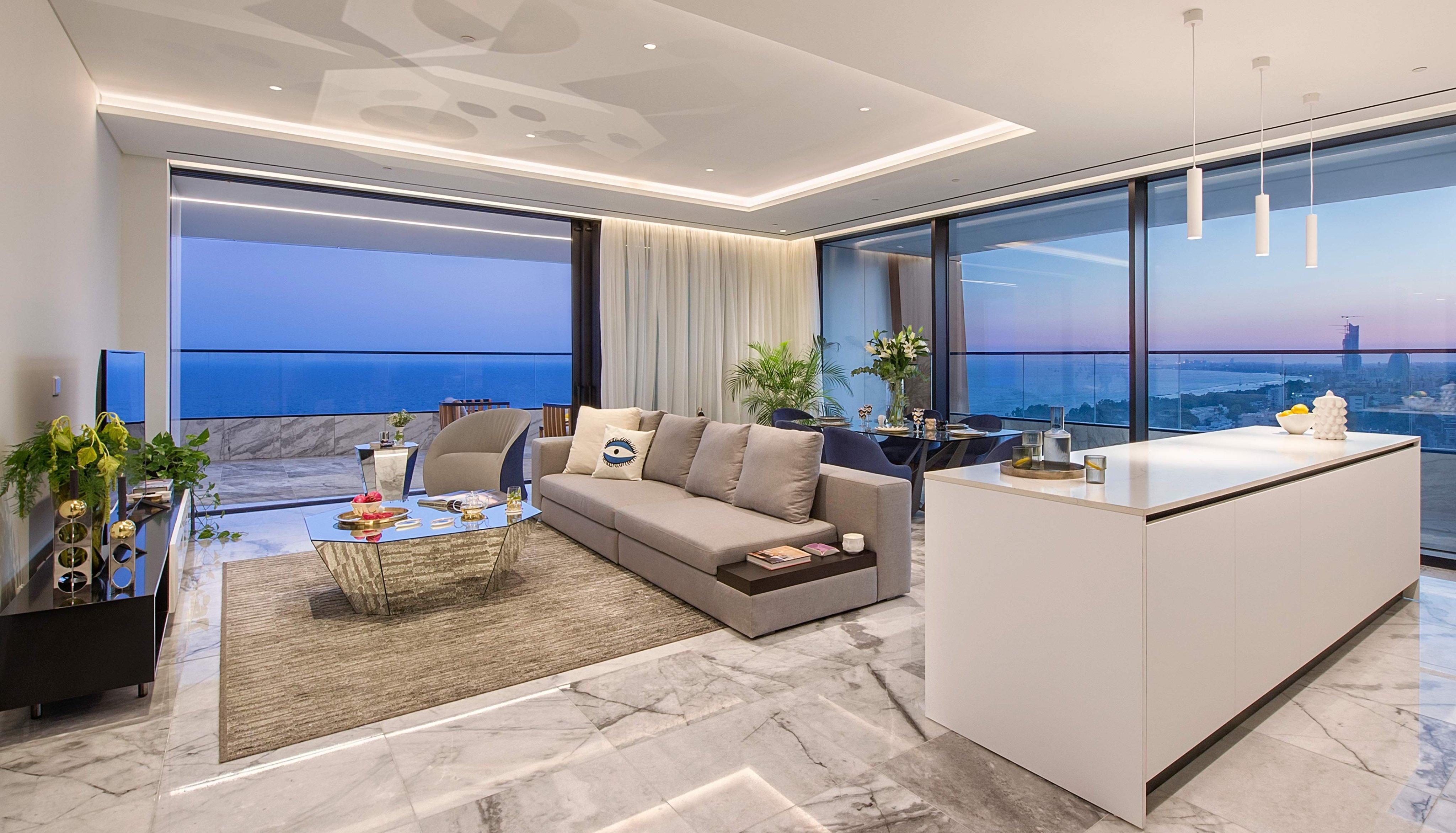 It goes without saying that the apartments in the complex are truly luxurious. Great views not only from living rooms, but from any room. This is the sea, the Marina of Limassol and the city center. The decoration is made of natural and environmentally friendly materials, kitchen appliances were brought from Germany. All apartments (1-, 2- and 3-bedroom apartments are available) are equipped with a “smart home” system, improved heating and air conditioning system.