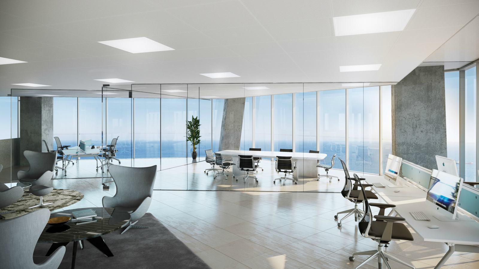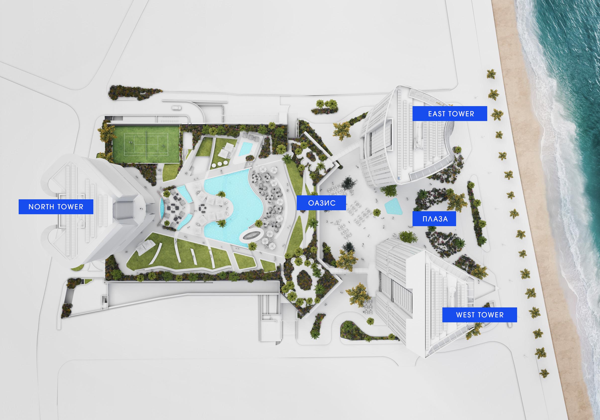 The second is that in the complex you can not only live, but also work. Yes, one of the towers (West Tower) offers 52 offices for sale or rent. Each of the offices has a magnificent sea view, as well as high-quality service: a private lobby with separate elevators (so that residents and businessmen do not interfere with each other), high-speed digital communications, 24-hour concierge service and parking.