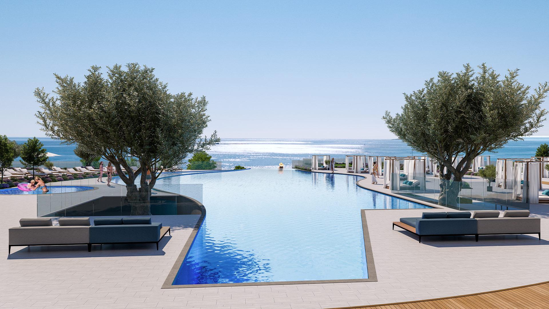 Special attention should be paid to the 50-meter outdoor pool - it will also be located in the open air. However, it is not far from the sea: only 50 meters from a well-maintained and clean beach. Also the common area will have: